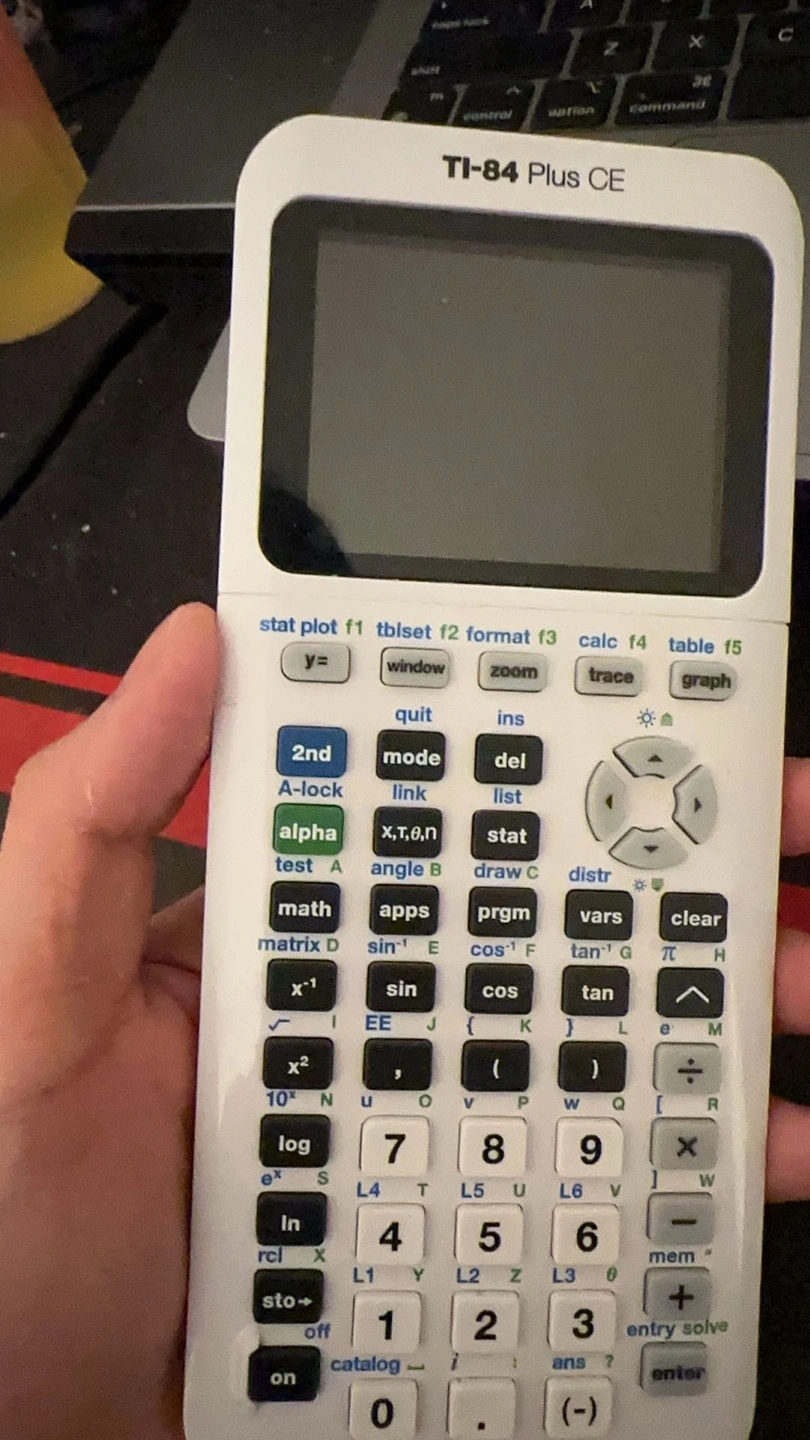 TI-84 Plus CE graphing calculator. Includes all standard buttons. White in color. It also come with the cable charger
