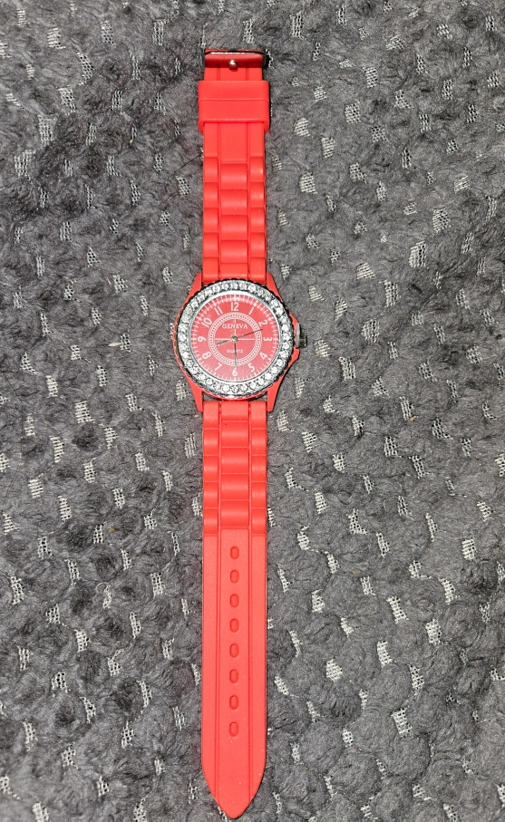 Red watch with rhinestones around the bezel. Silicone band. #Freecycle