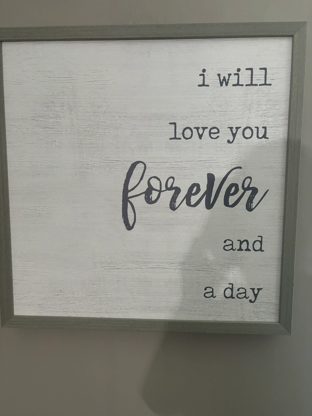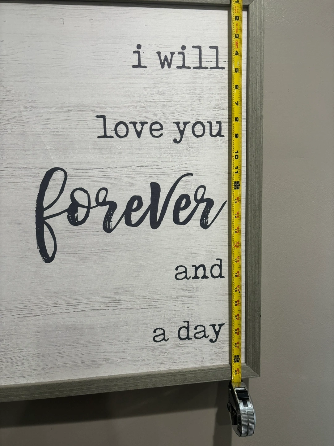 20Extra large Framed canvas wall decor with the phrase 'I will love you forever and a day'. Measures approximately 11 inches by 15 inches.