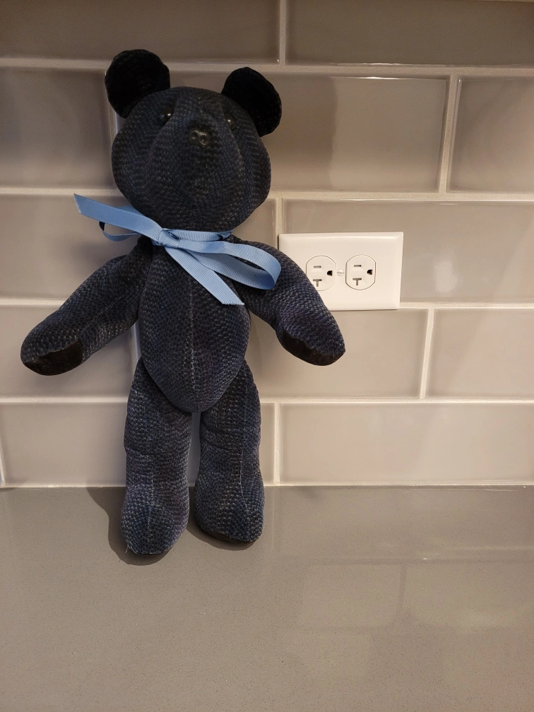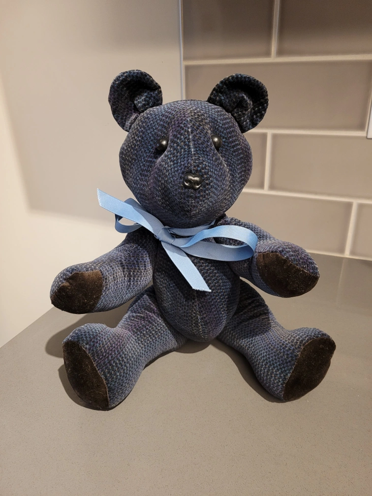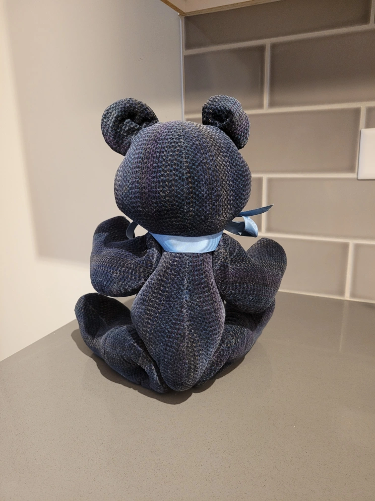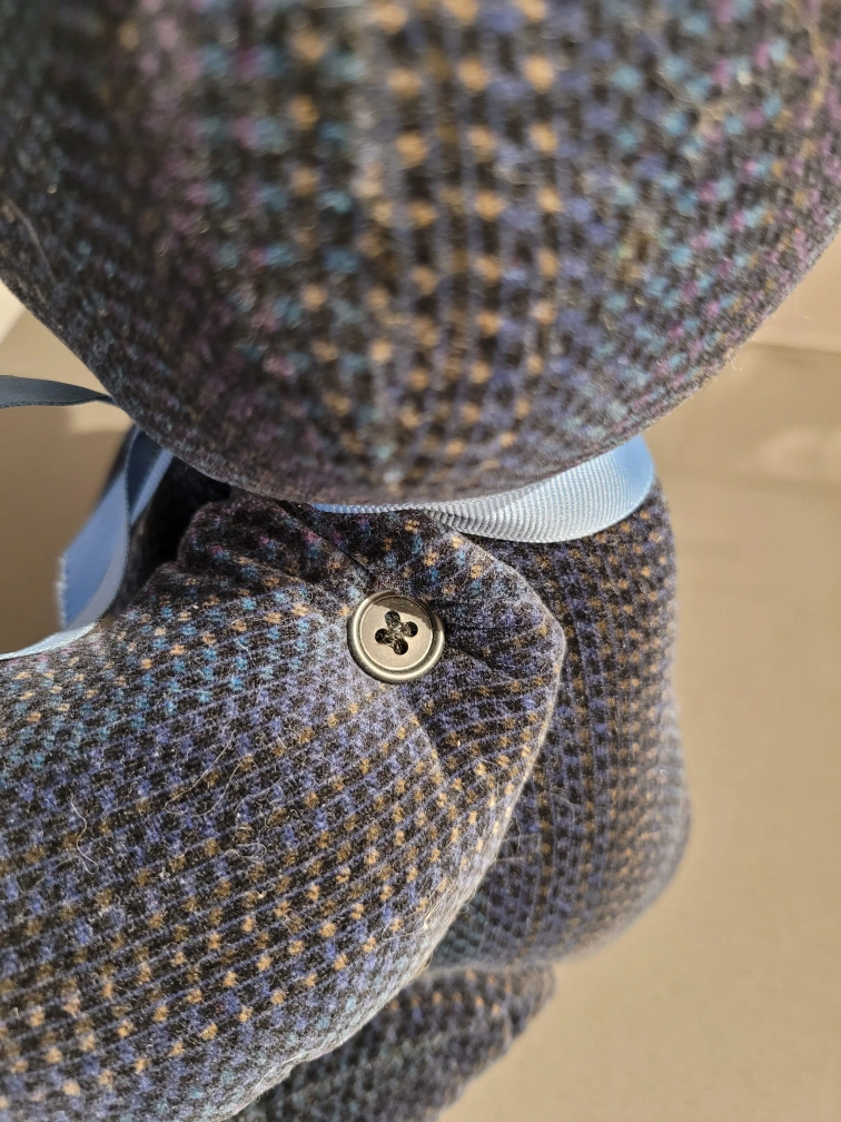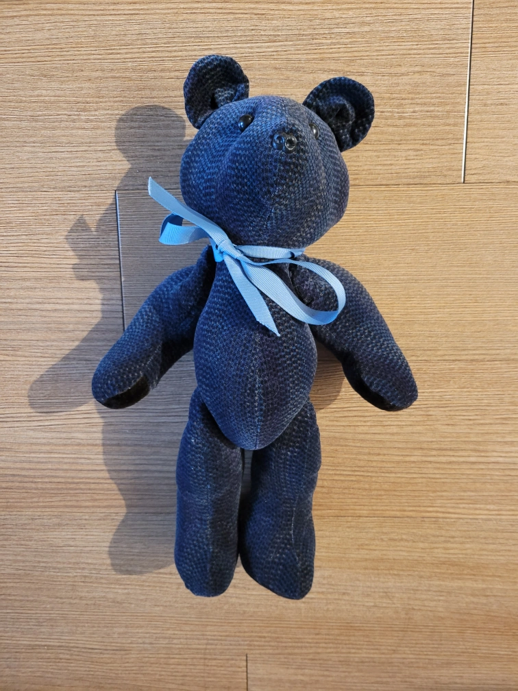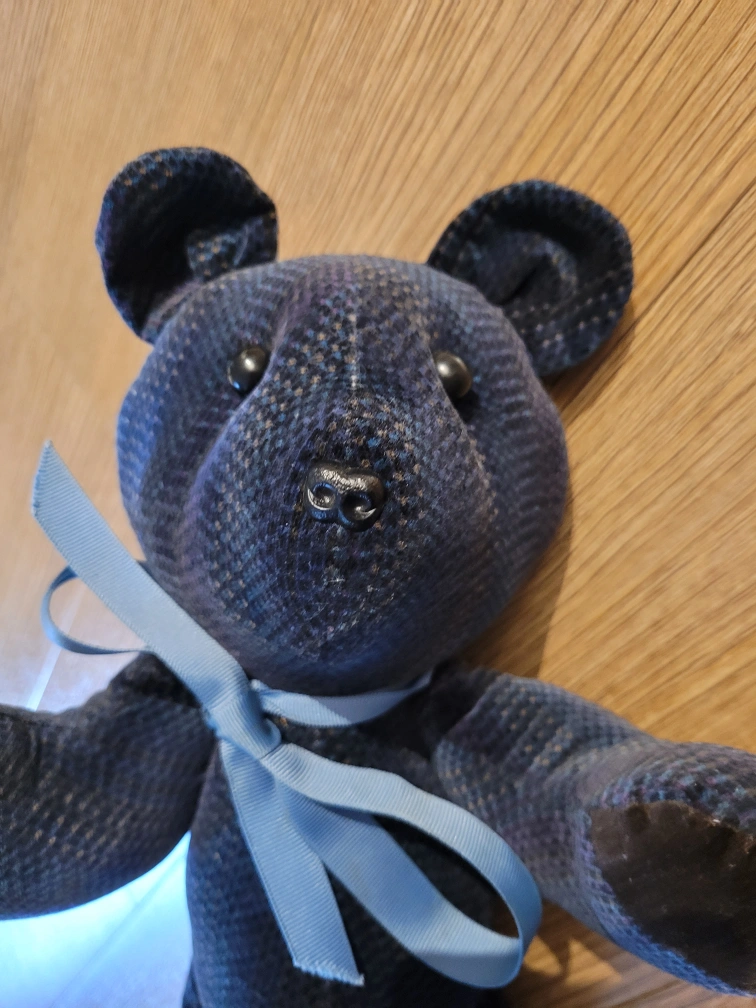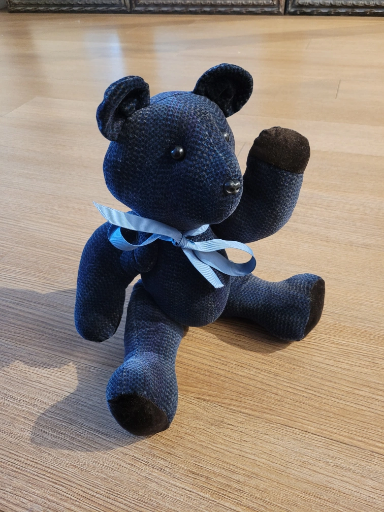 Blue and black plaid teddy bear. Bear has a blue bow tie and buttons. Movable limbs. Great condition and very well made. Approximately 16 inches long.
