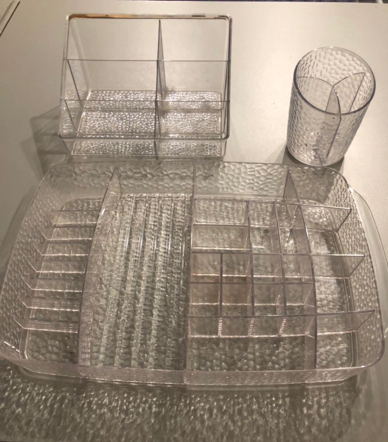 Three piece clear plastic organizer set. Includes a divided tray, a tall organizer with 3 sections, and a divided cup.