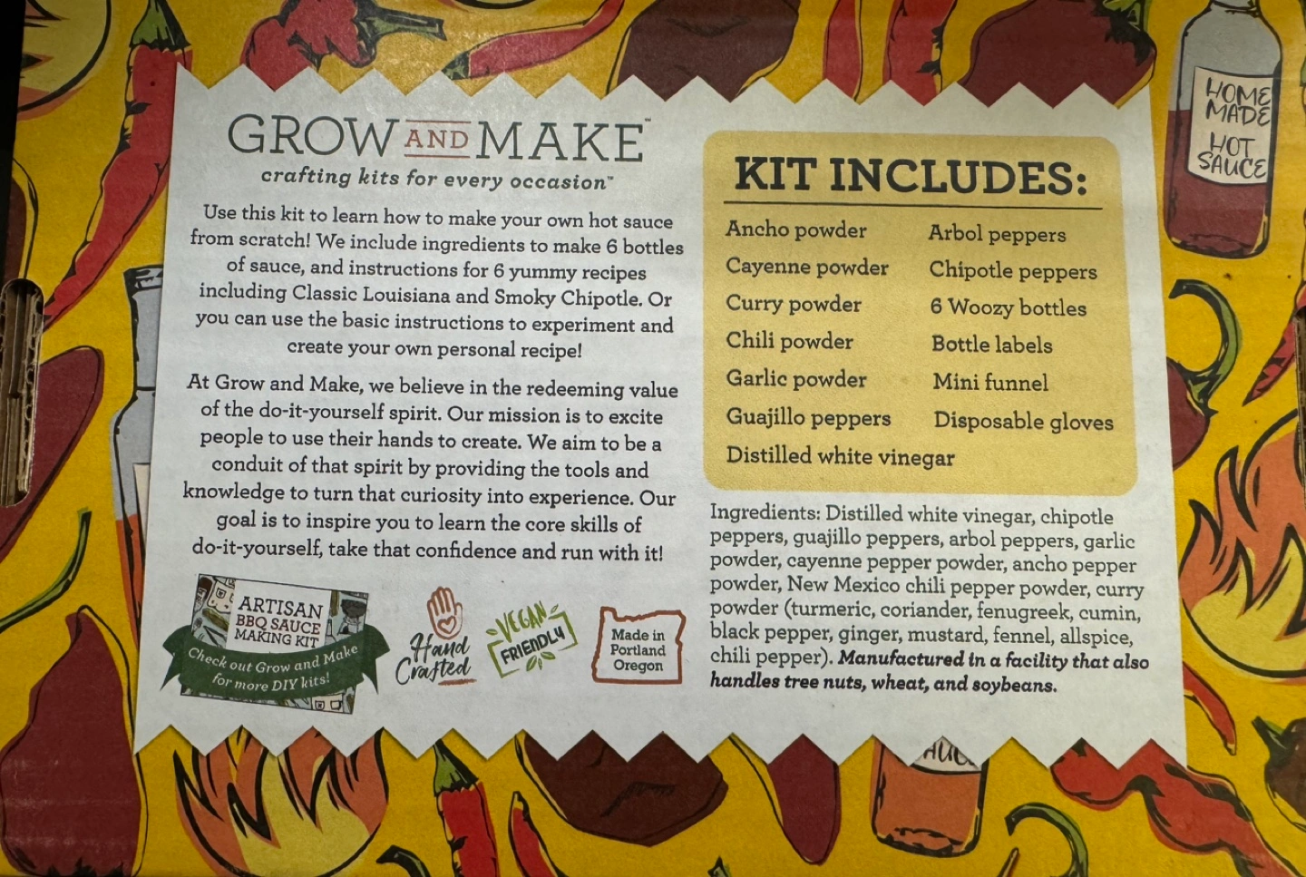 Learn how to make 6 bottles of hot sauce at home. Includes all ingredients, bottles, labels, and tools.