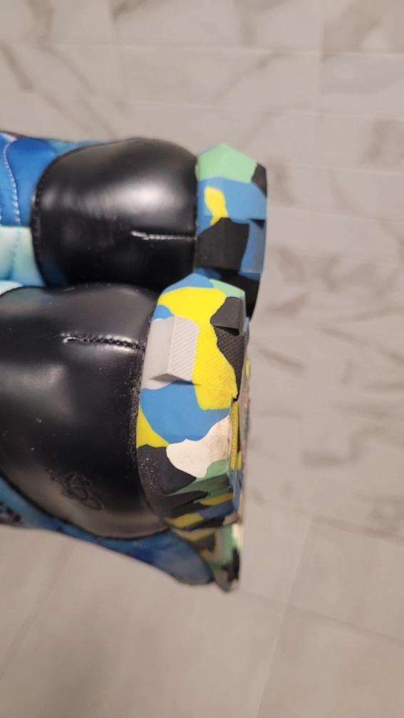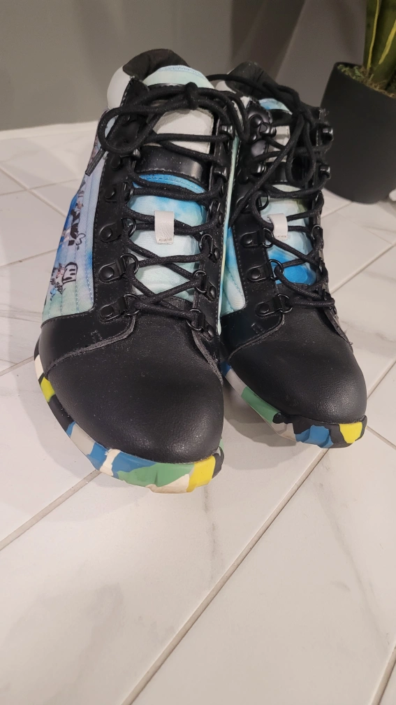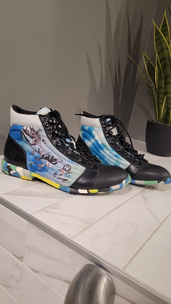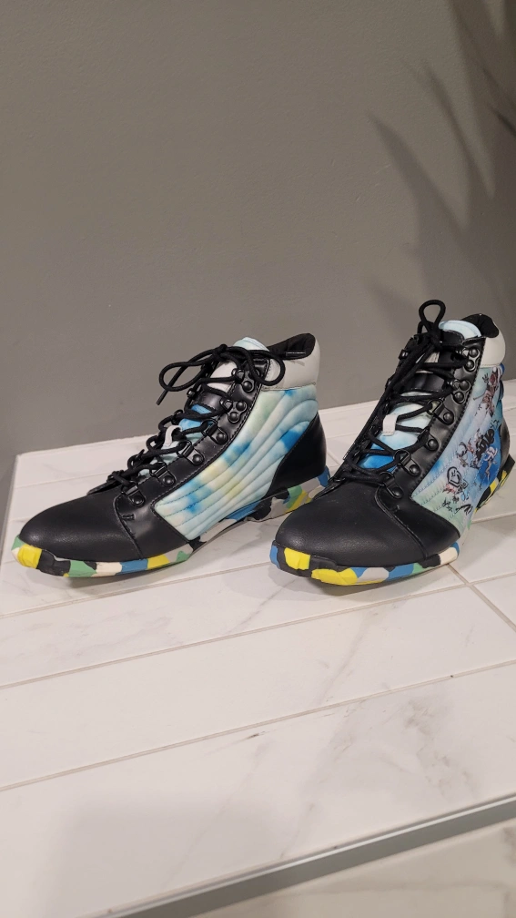 484Black leather high top sneakers with blue and white tie dye pattern on the back of the shoe. The bottom of the shoe has a colourful camo pattern. Mens 6 Womens 8.5