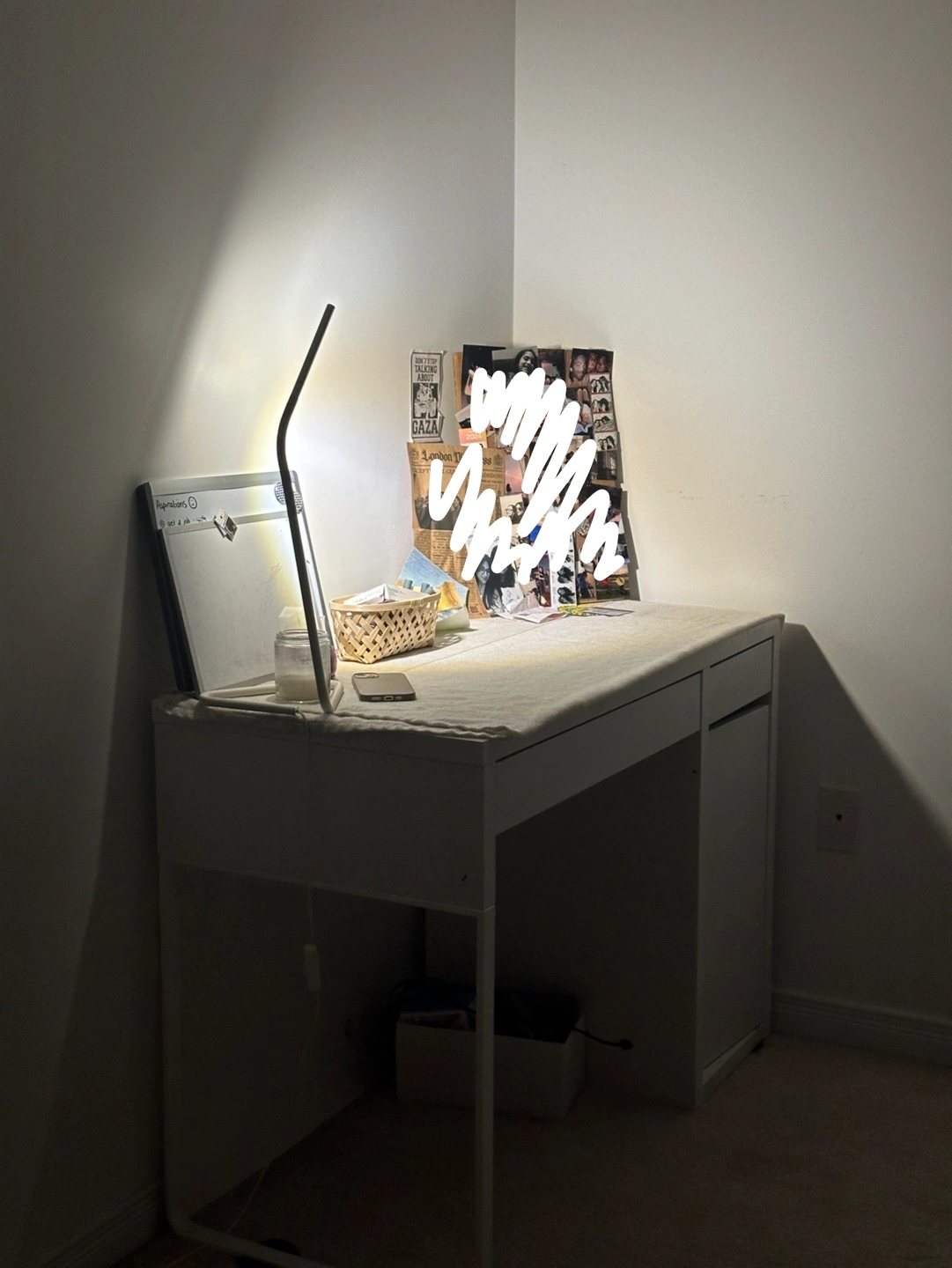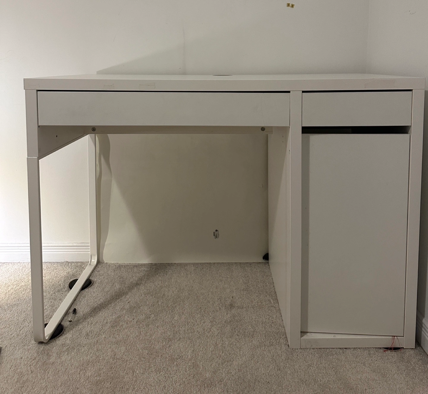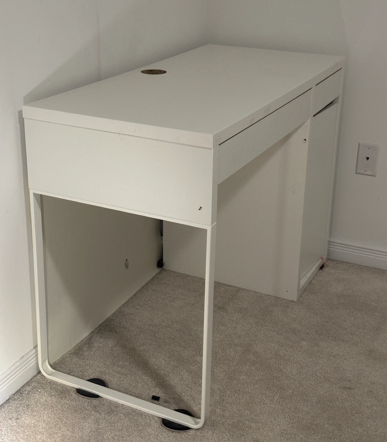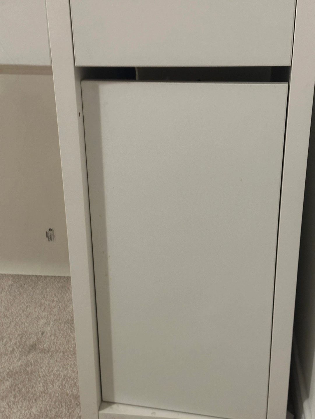 White study table. No stains ( just some tape that I’ll remove and wipe down ) The cabinet doesn’t close all the way because I took off the shelves (but i still have the shelves)