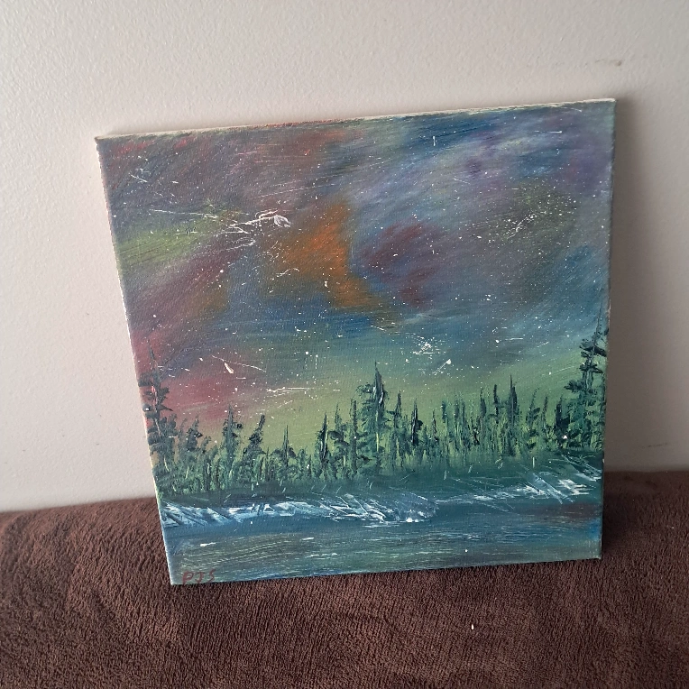 15Original painting of the northern lights with a forest and water in the foreground. The painting is signed. 12x12