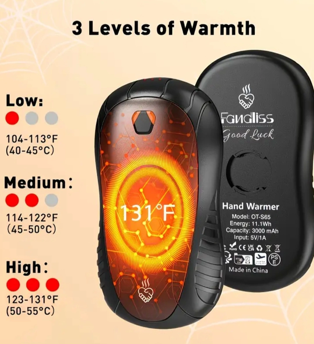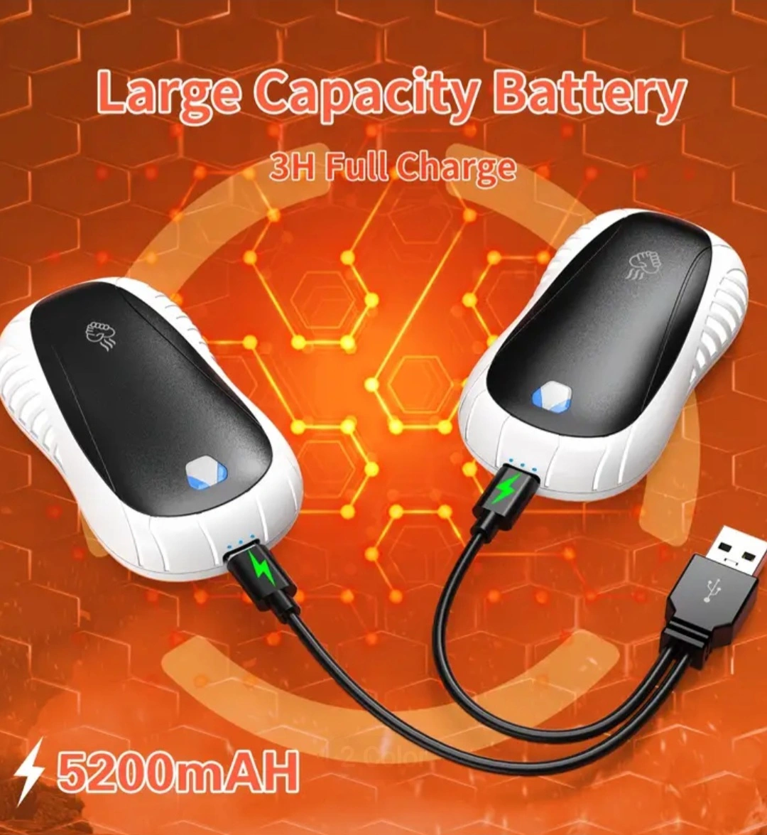 188Rechargeable hand warmers, 2 pack. 3 heat modes 13 hours Long-lasting warmth heat 5200 mAh battery. Includes USB cable charger color Black