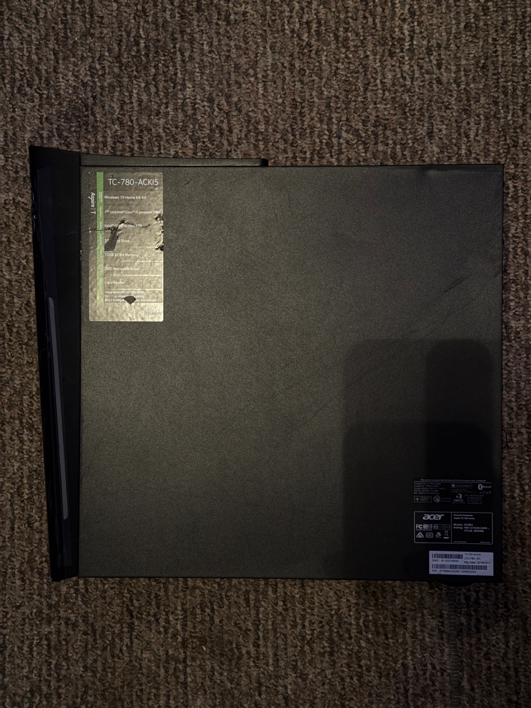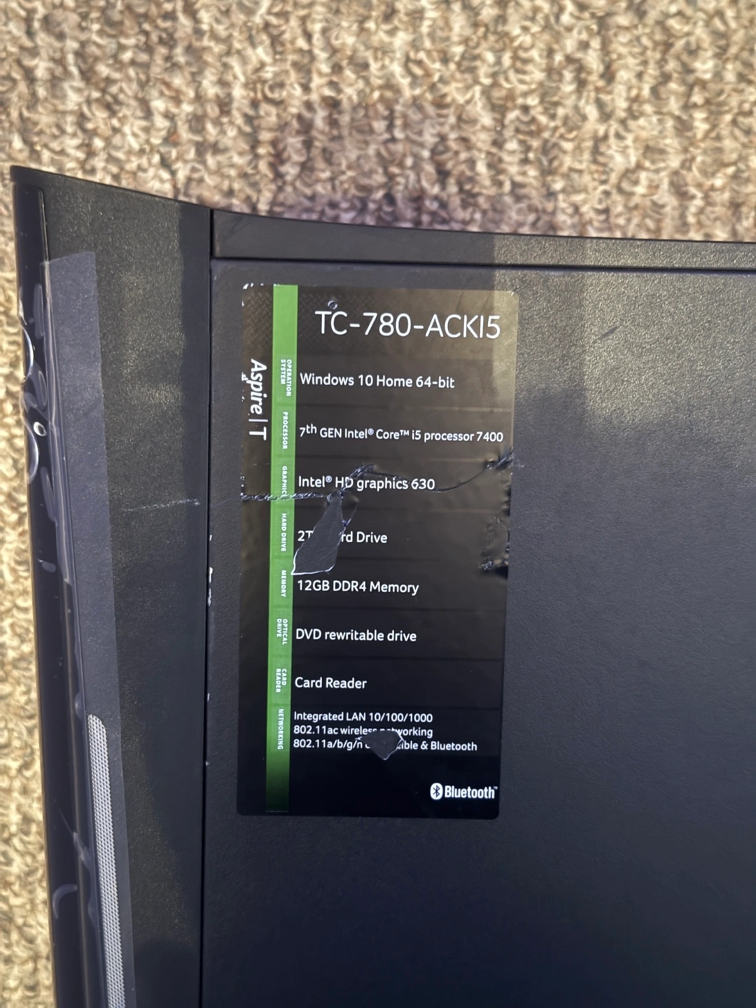 Windows 10 Home 64-bit. 7th Gen Intel Core i5 processor 7400. Intel HD graphics 630. 4GB DDR4 memory.300WPower Supplier. DVD rewritable drive. Card Reader. Wireless WI-FI & Bluetooth.Without HDD