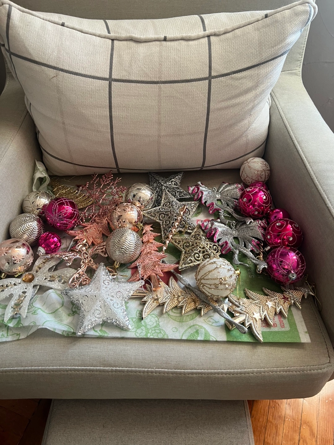 692Set of Christmas ornaments includes stars, trees, and bows. Silver, gold, and pink colors. Glittery finish.