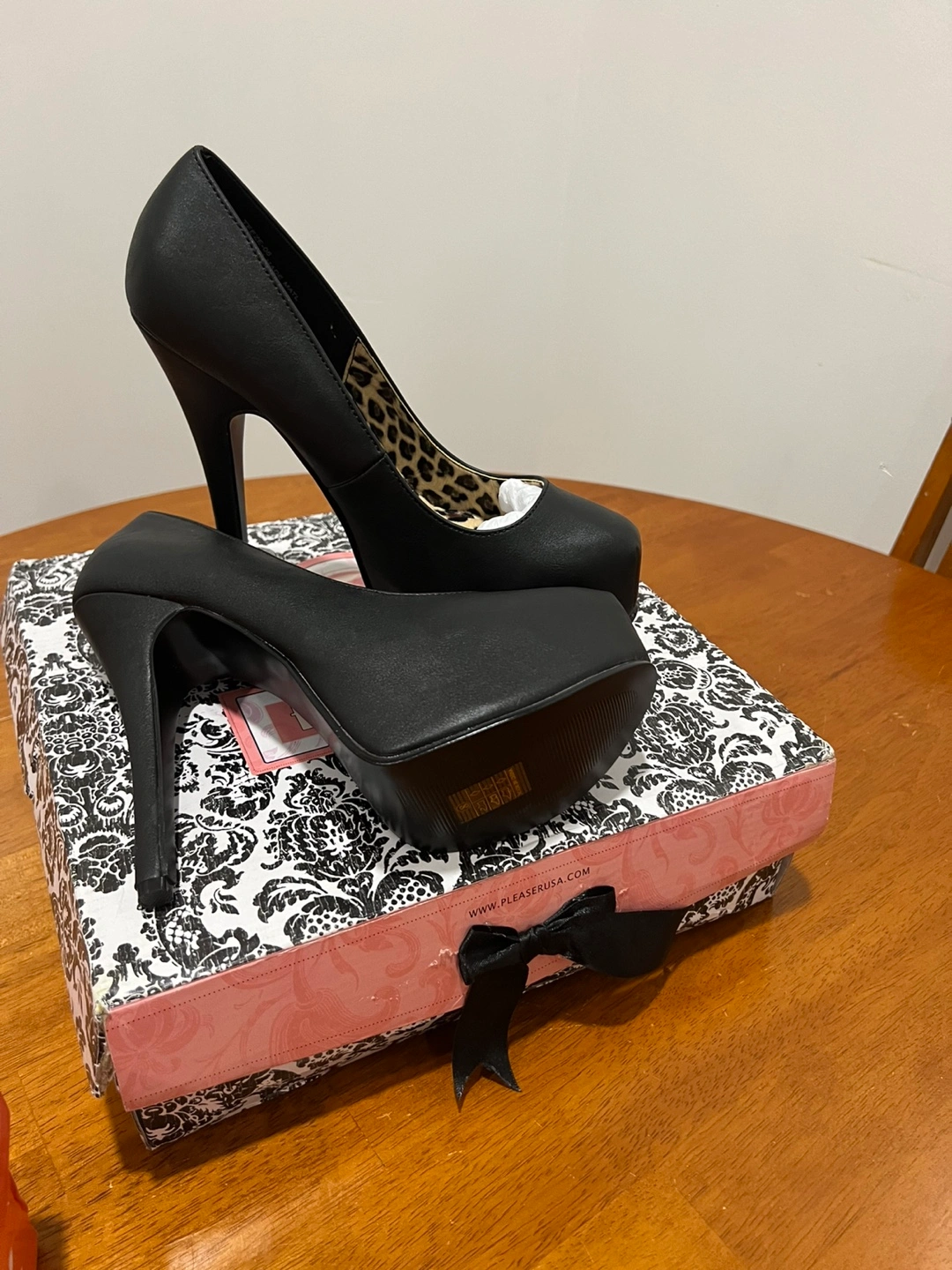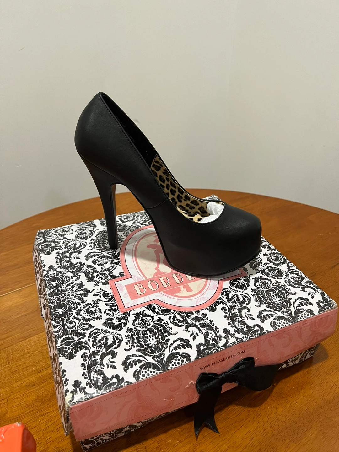 Black platform heels with a stiletto heel. The insole is leopard print.