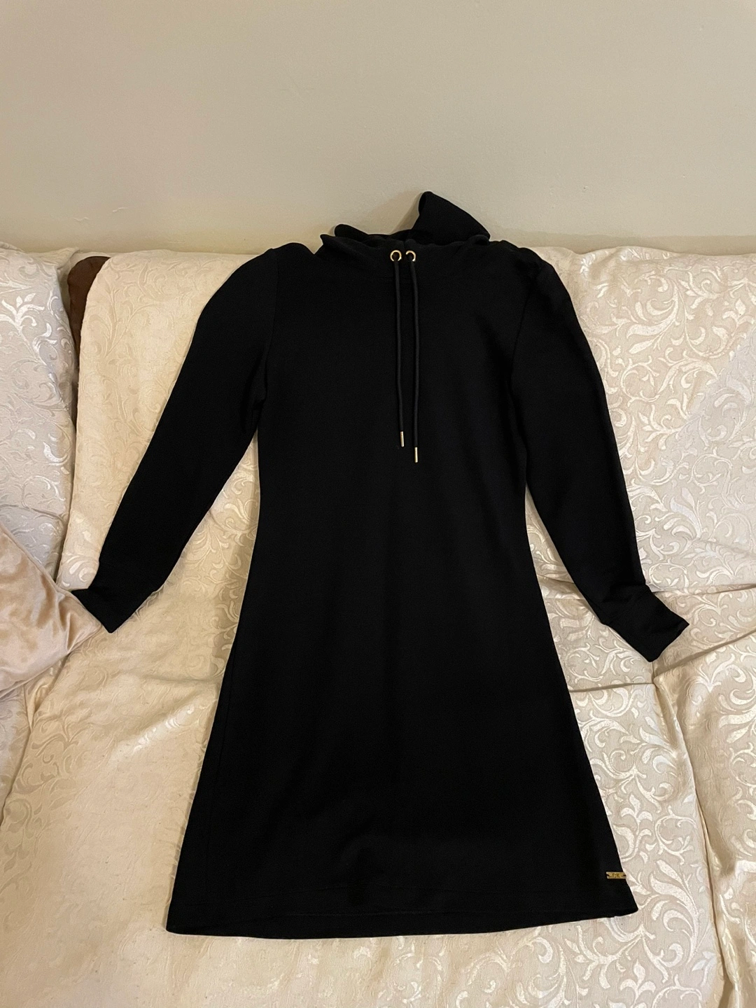 475Black hoodie dress with long sleeves and a drawstring hood. Small size.