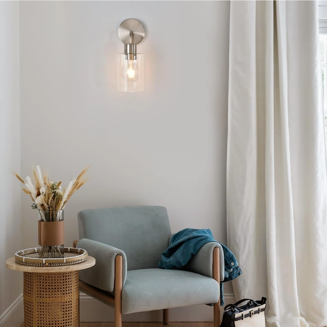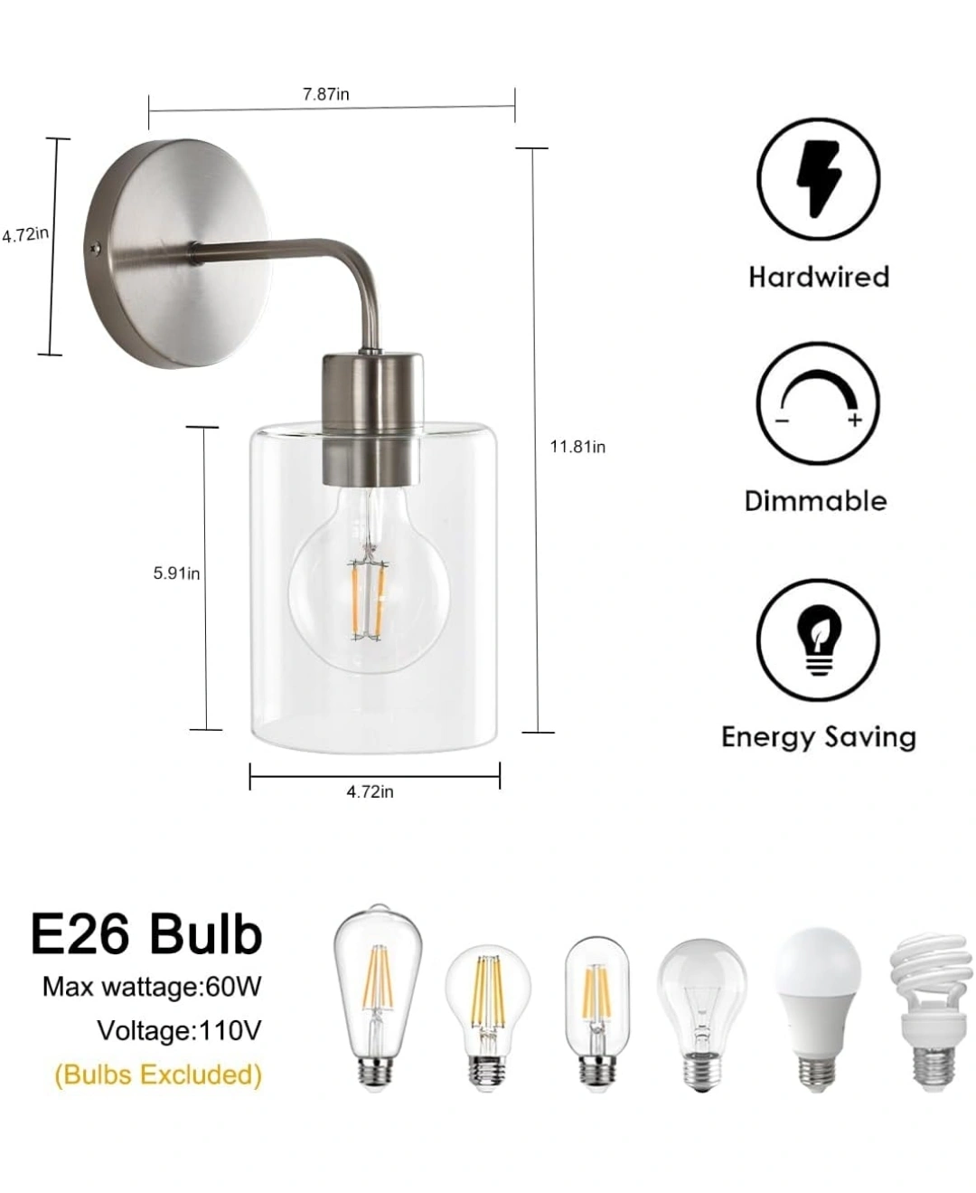 2 Pack Brushed Nickel Wall Sconces with Clear Glass Shades. Hardwired, dimmable, and energy saving. E26 bulb, max wattage 60W. Bulbs excluded.