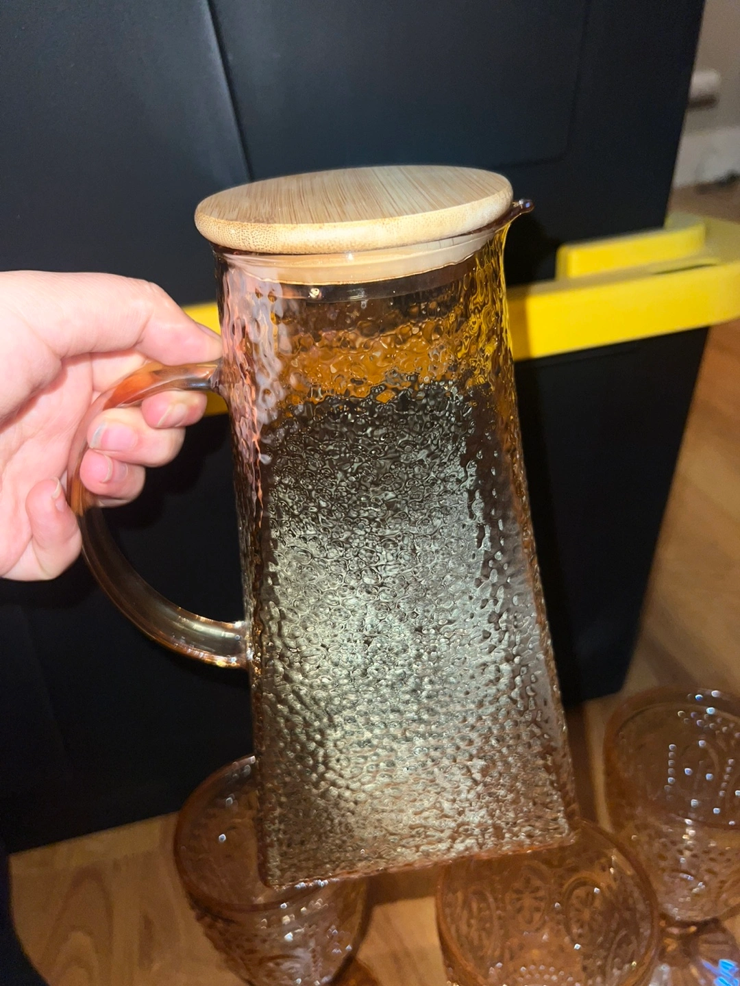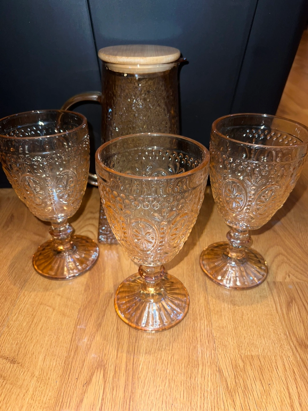 Set of 3 wine glasses and a glass pitcher with a wooden lid. Great for entertaining guests. Need gone asap due to moving Make offers and make bundles!