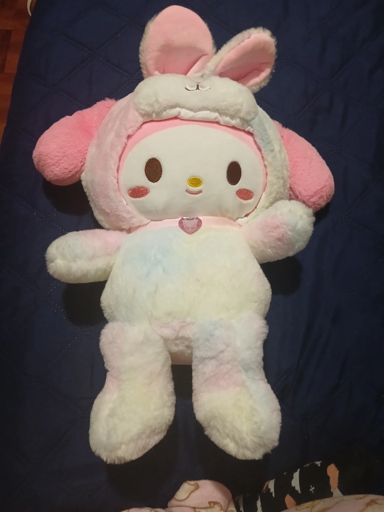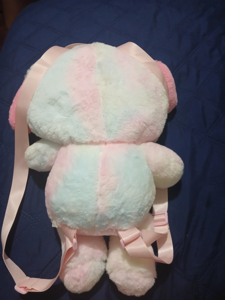 1000+Large plush backpack with a pink and white tie dye pattern. Features a My Melody design with bunny ears and a pink bow. Length 54 cm / 21.26 in