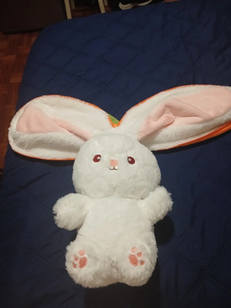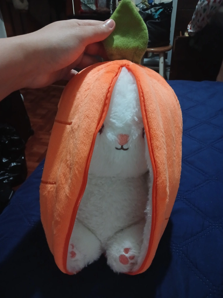 1000+White bunny plush toy that can be zipped inside a carrot plush toy. The carrot has a green leaf on top. length 37 cm / 14.6 in