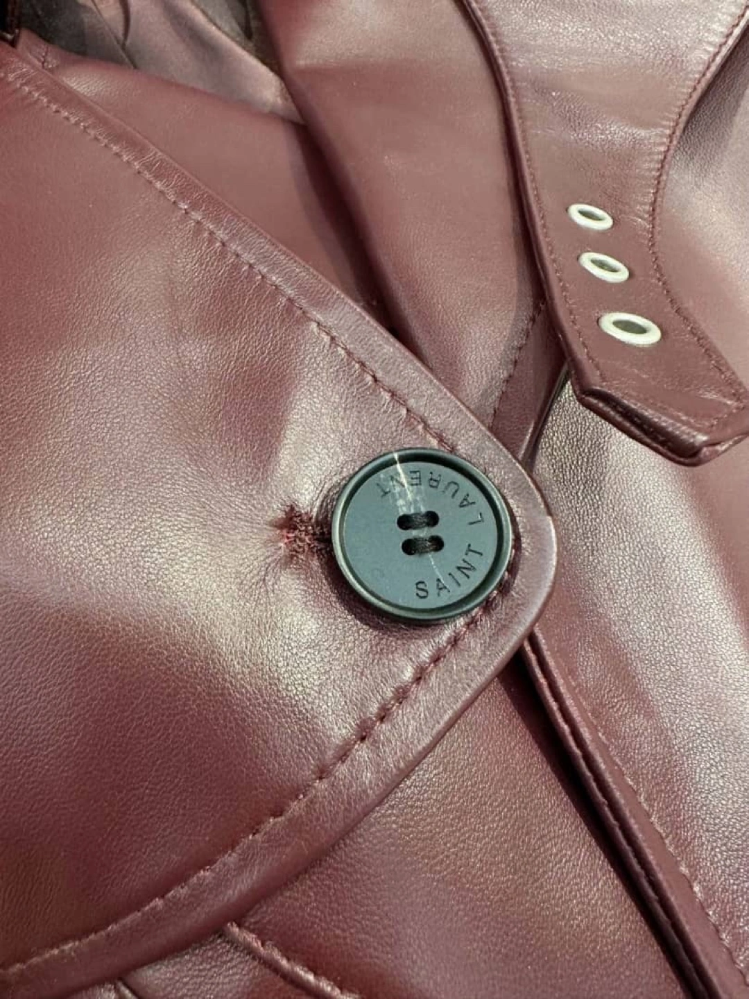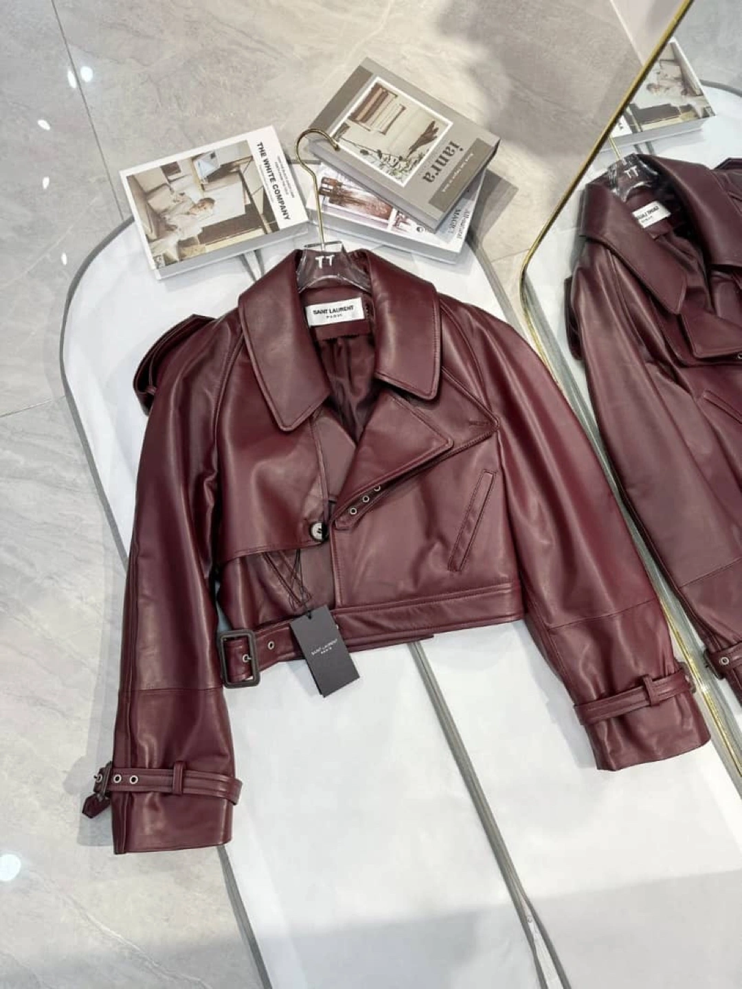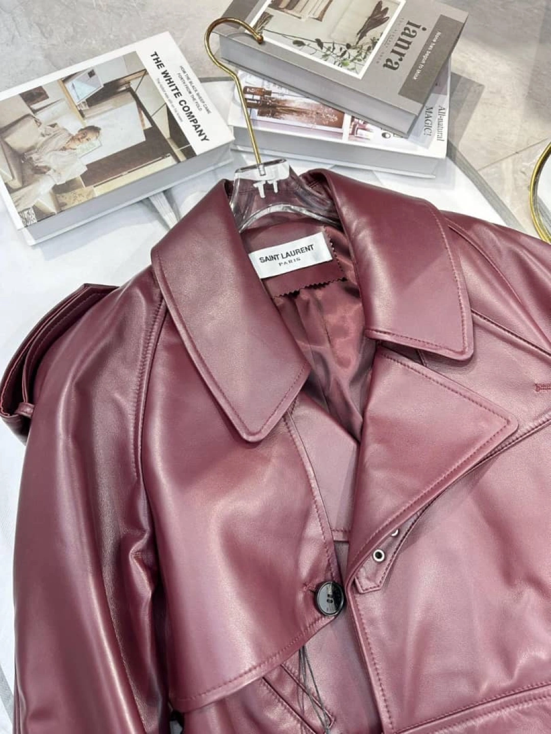 Burgundy leather jacket with a belt and a collar. Long sleeves with a button closure at the wrists.