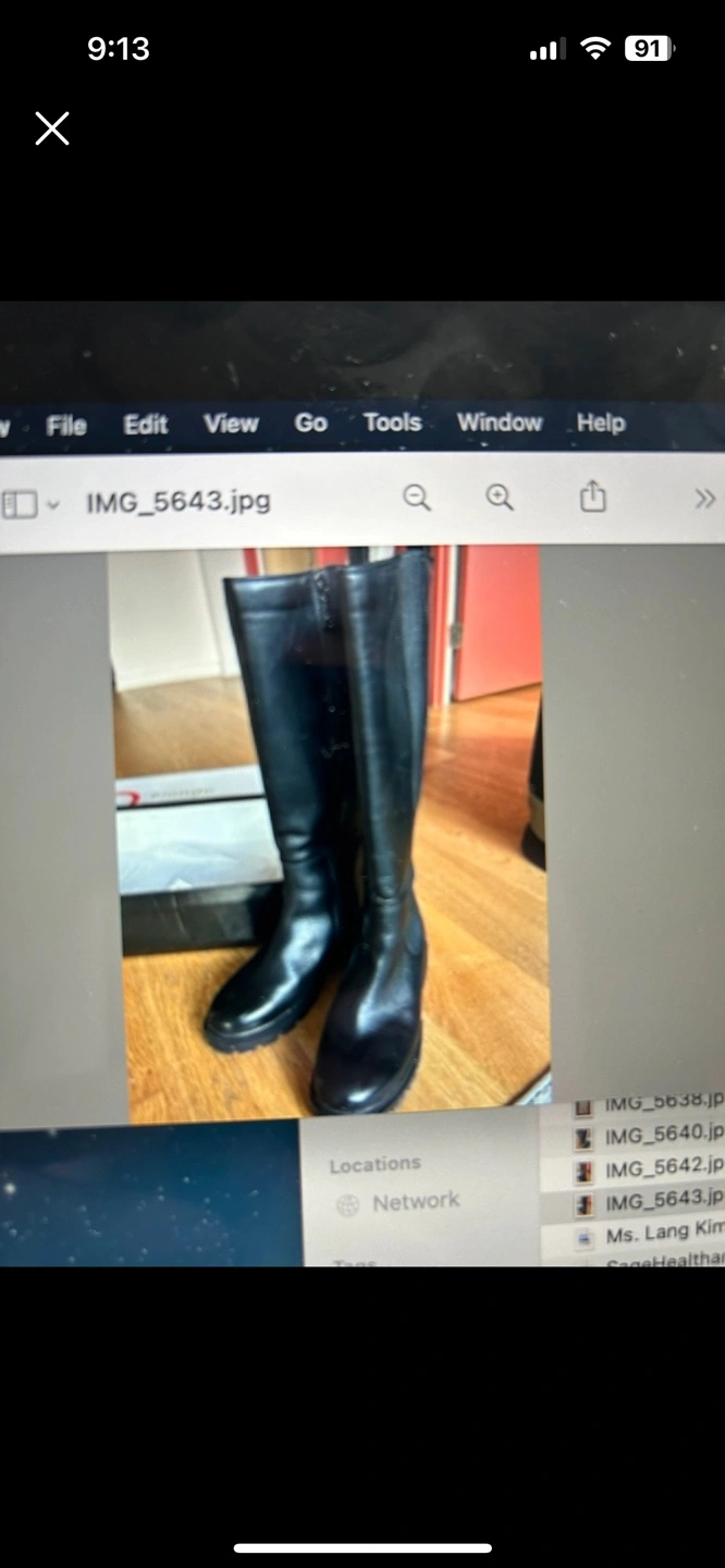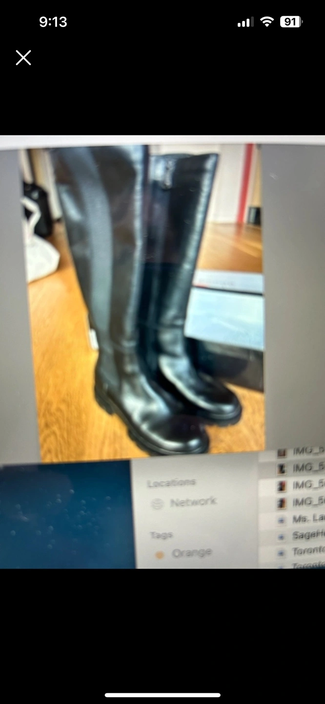 Black leather knee-high boots. Waterproof and comfortable.