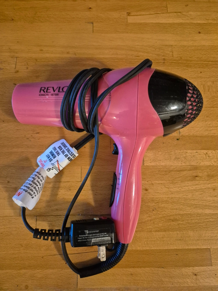 Pink hair dryer with 1875W of power. Comes with cord and plug.