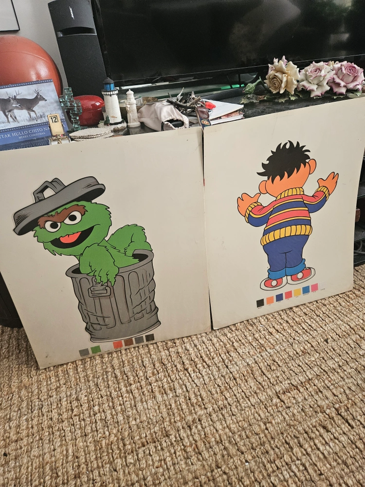 183Two vintage Sesame Street pieces featuring Oscar the Grouch and Bert. Both pieces are in good condition with minor wear and tear. (20x24)