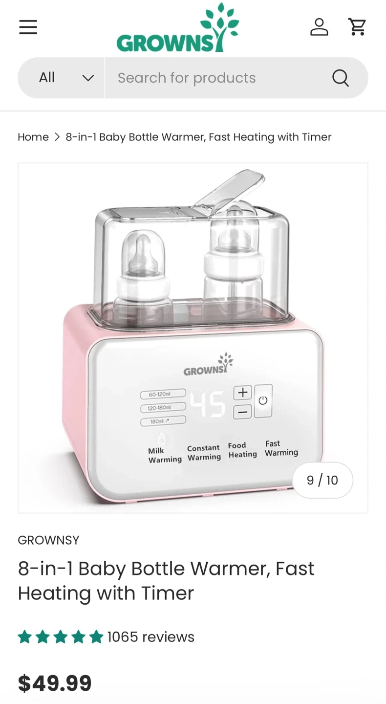 I'm selling a Grownsy 8-in-1 Baby Bottle Warmer! It has fast heating with a timer. It has settings for milk warming, constant warming, and food heating. Retails for $49.99
