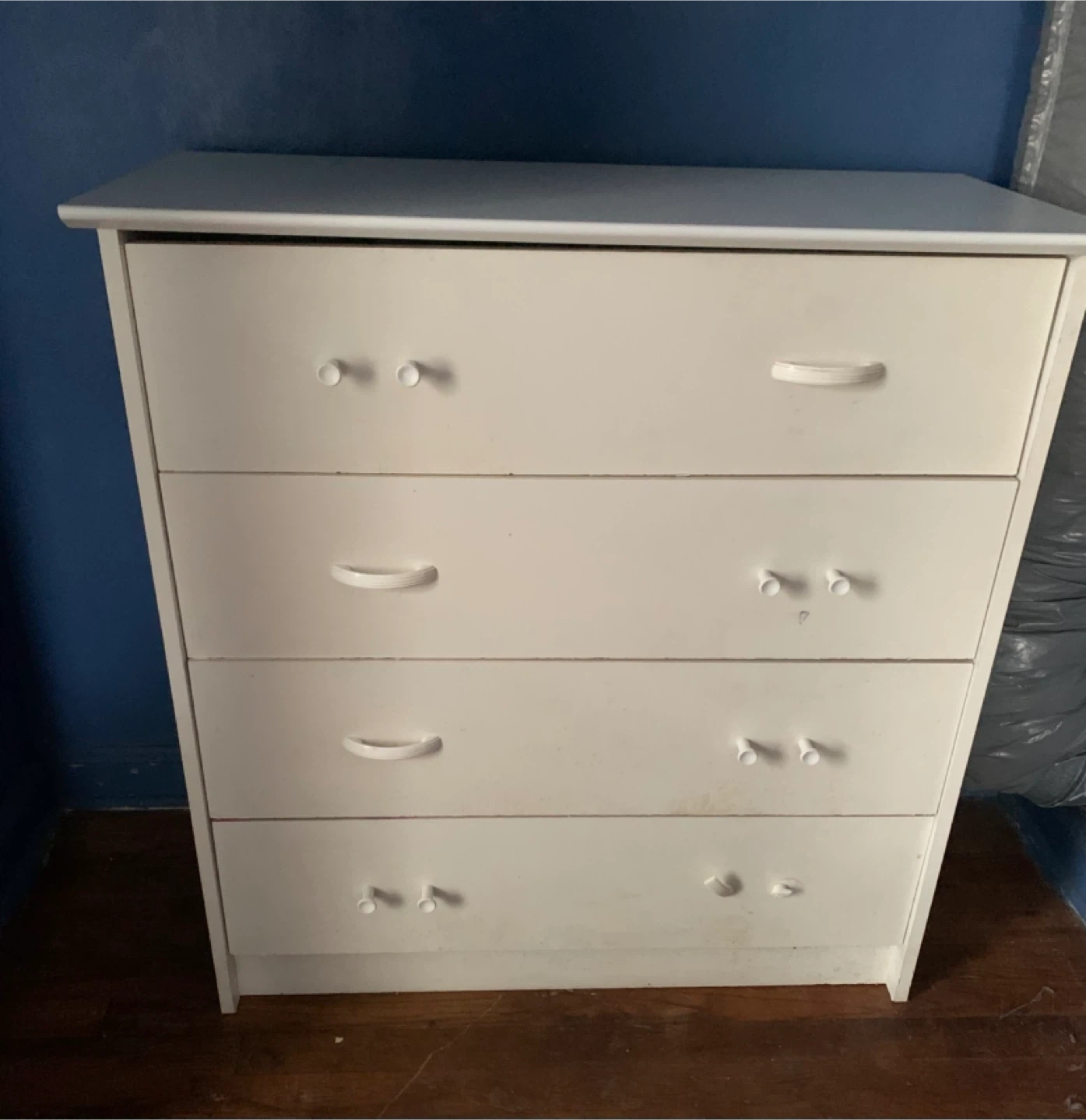 Selling a simple white dresser with four drawers. It's perfect for extra storage in a bedroom or closet. It has a few signs of use.