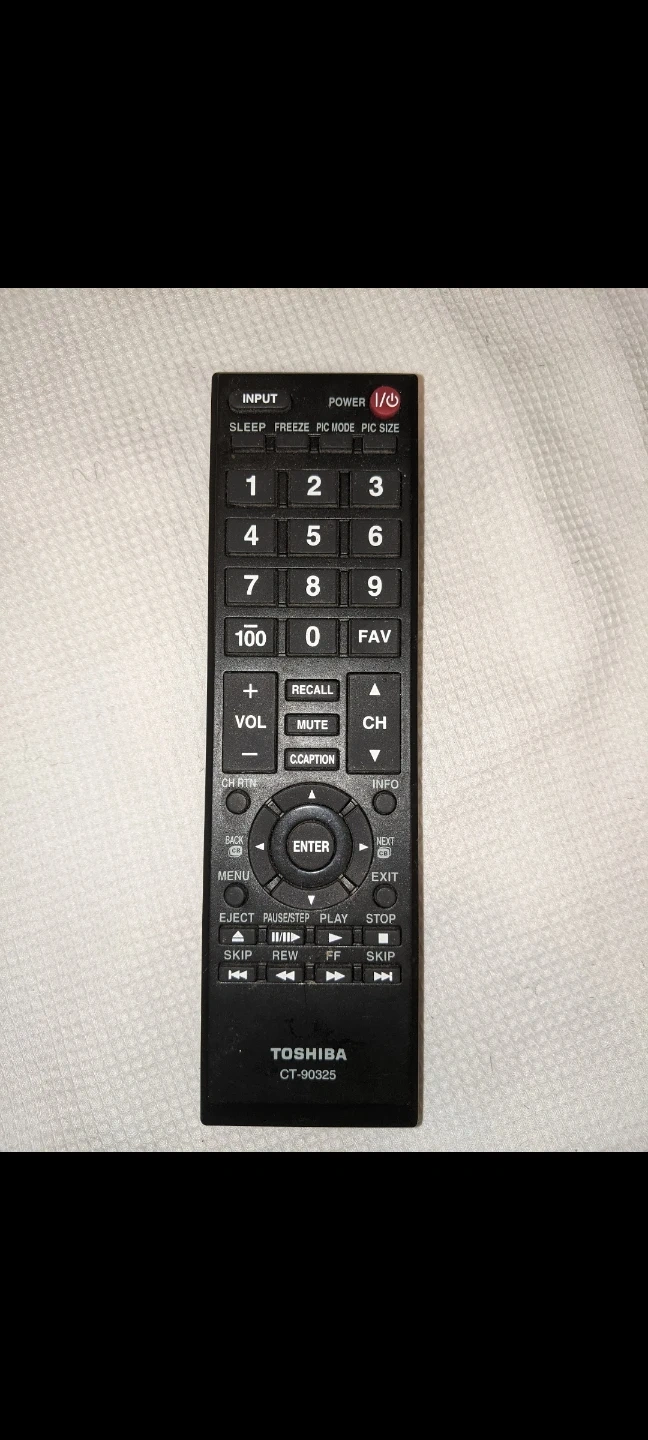 This is a Toshiba TV remote control, model CT-90325. It has a full numerical keypad and dedicated buttons for common functions like volume, channel, mute, and playback controls. This remote is compatible with various Toshiba television models.