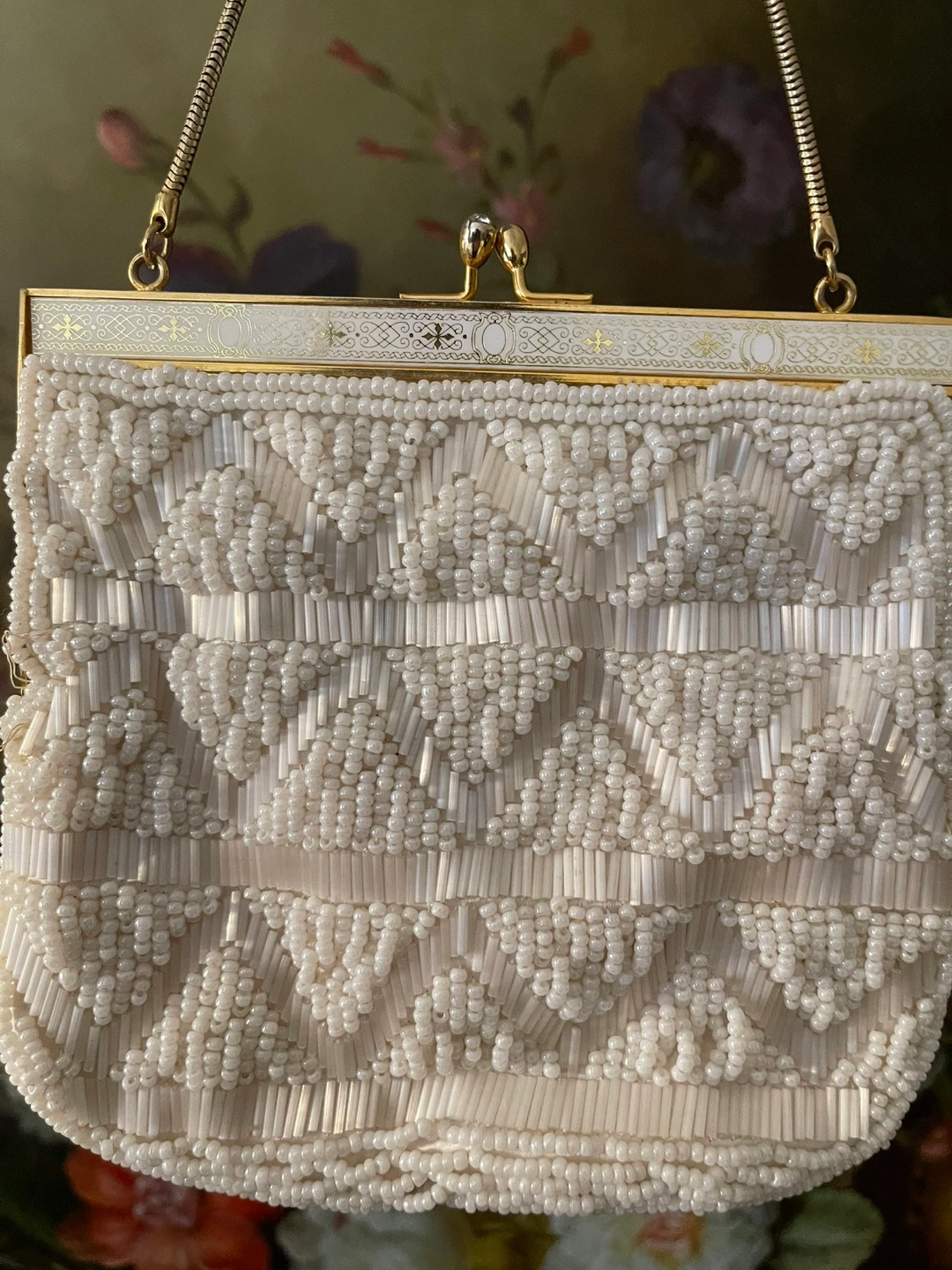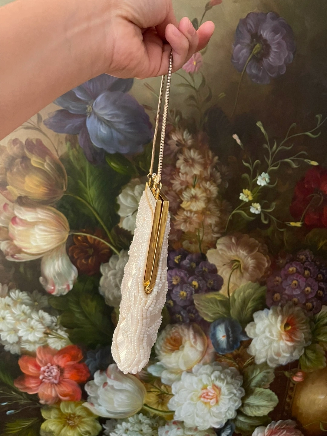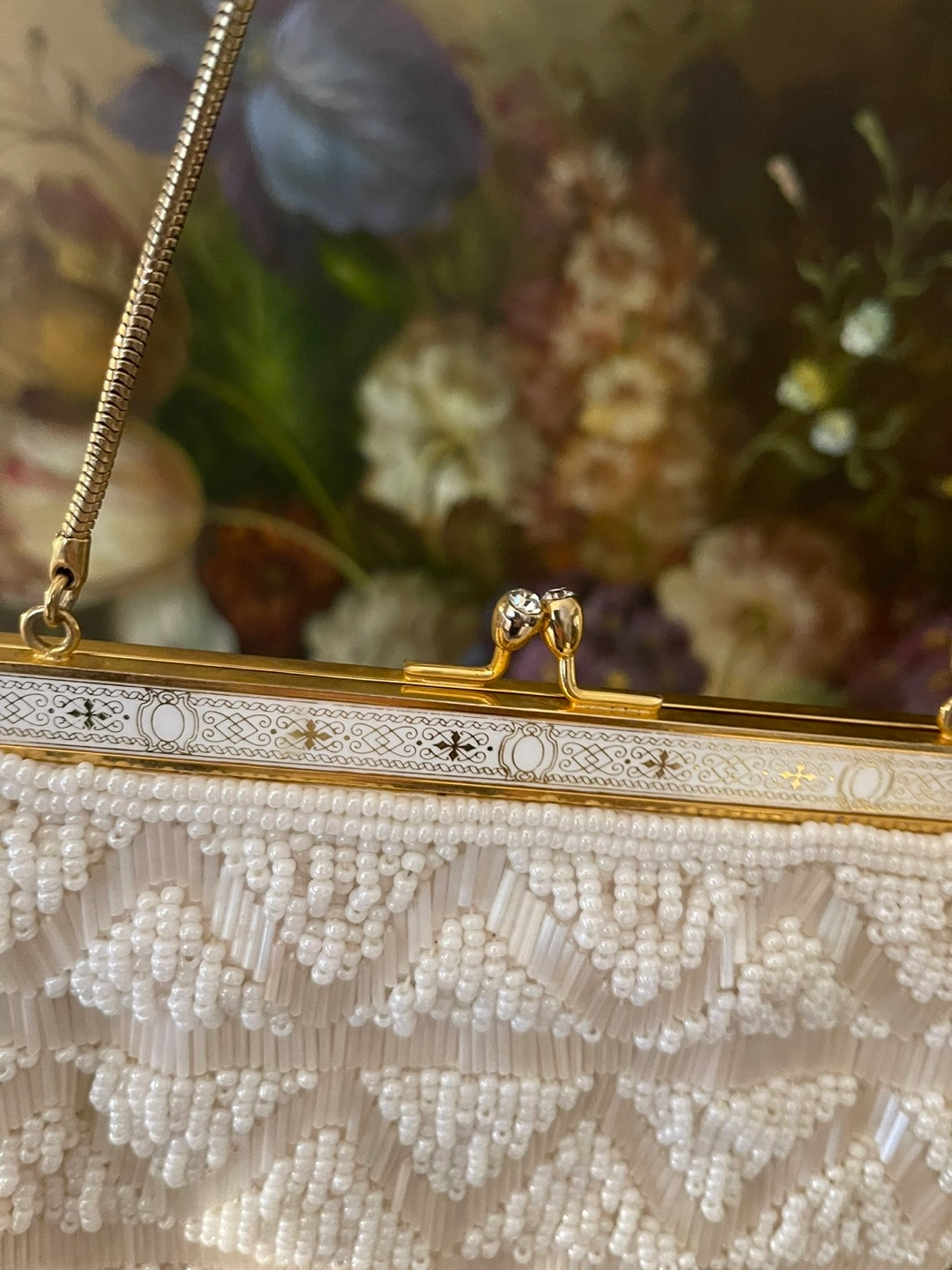 White beaded clutch with a gold chain strap and a clasp closure.