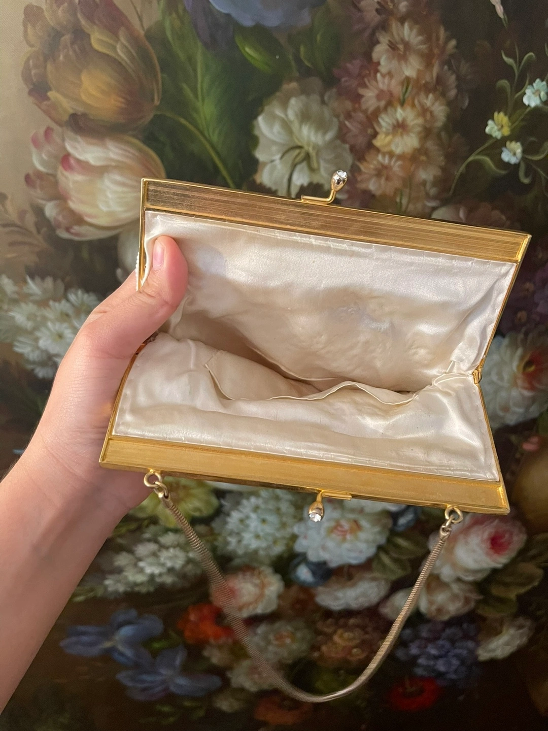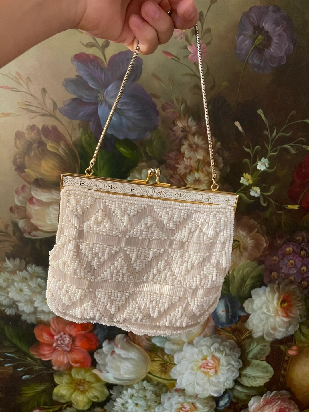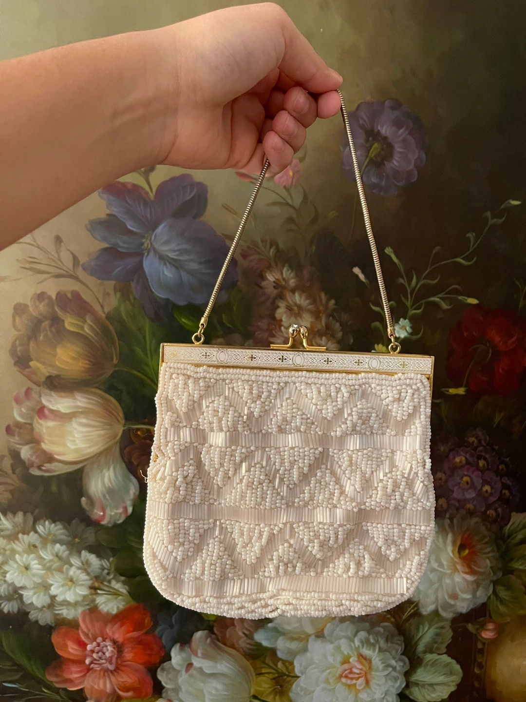 White beaded clutch with a gold chain strap and a clasp closure.
