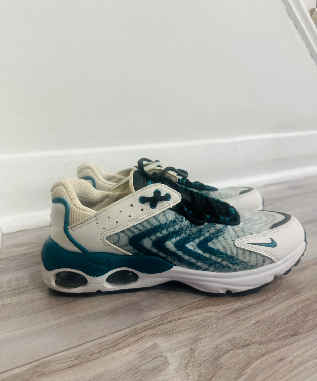 Preloved in good condition.porch pick up at Midland and Lawrence, Scarborough.(White and teal Nike sneakers. Size 5.5Y. Air Max 2000 style).