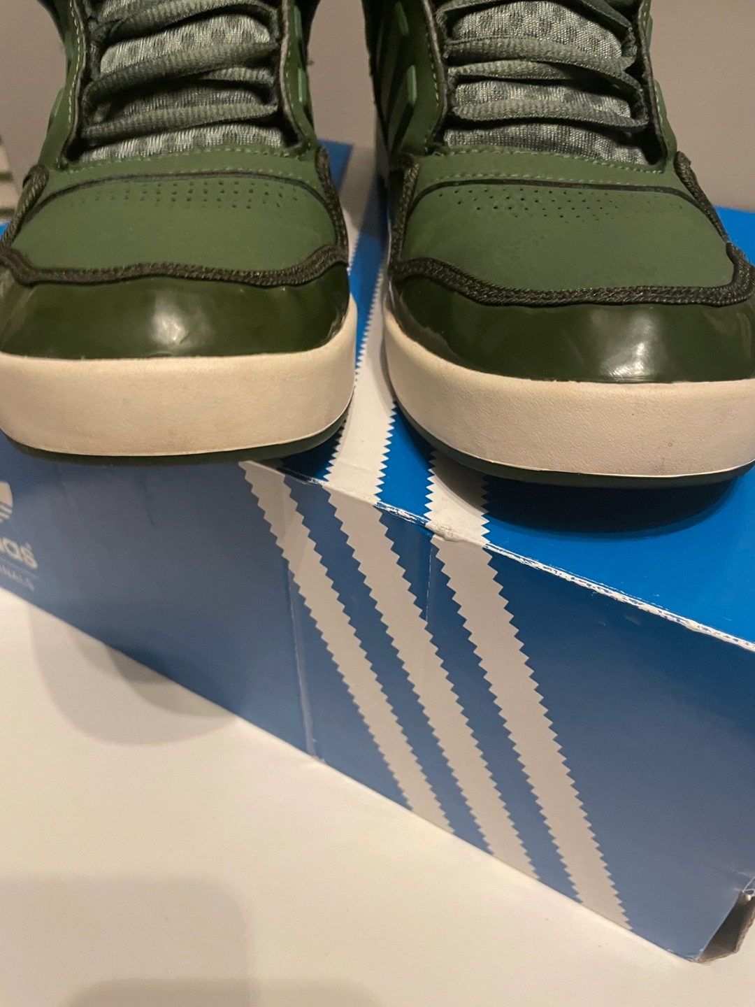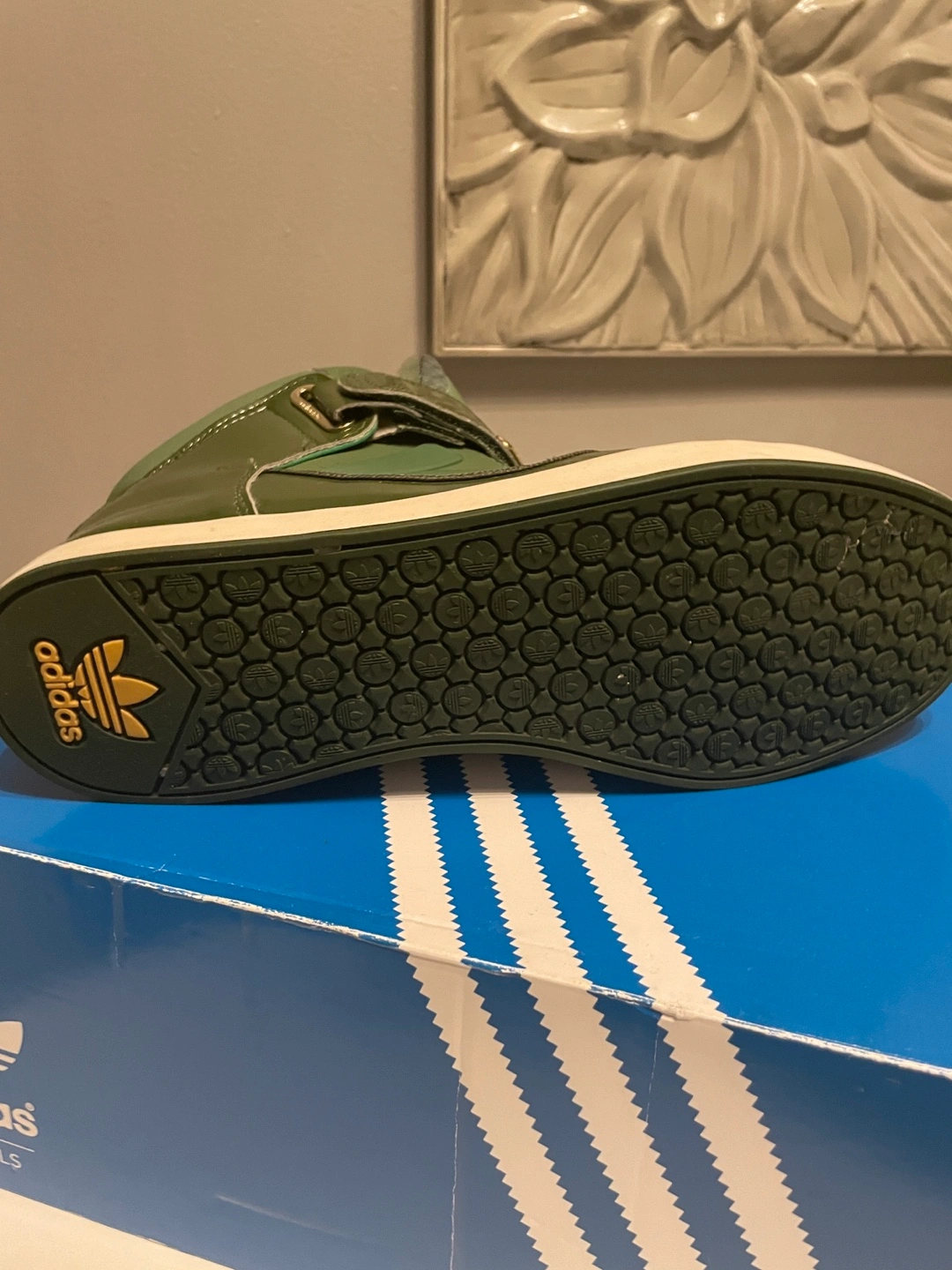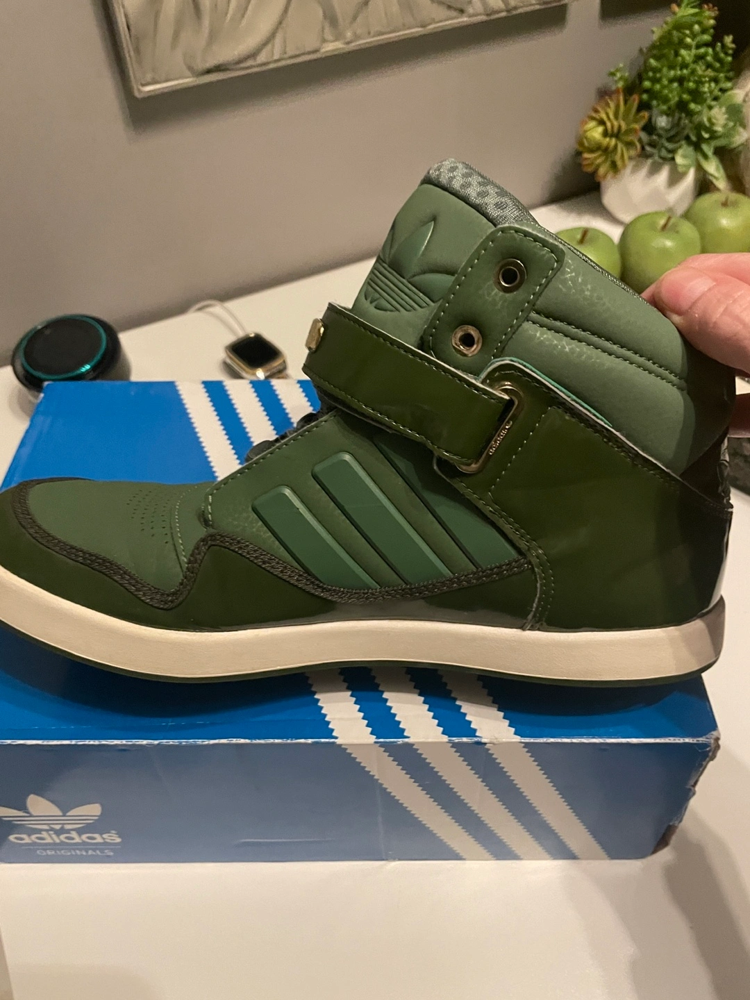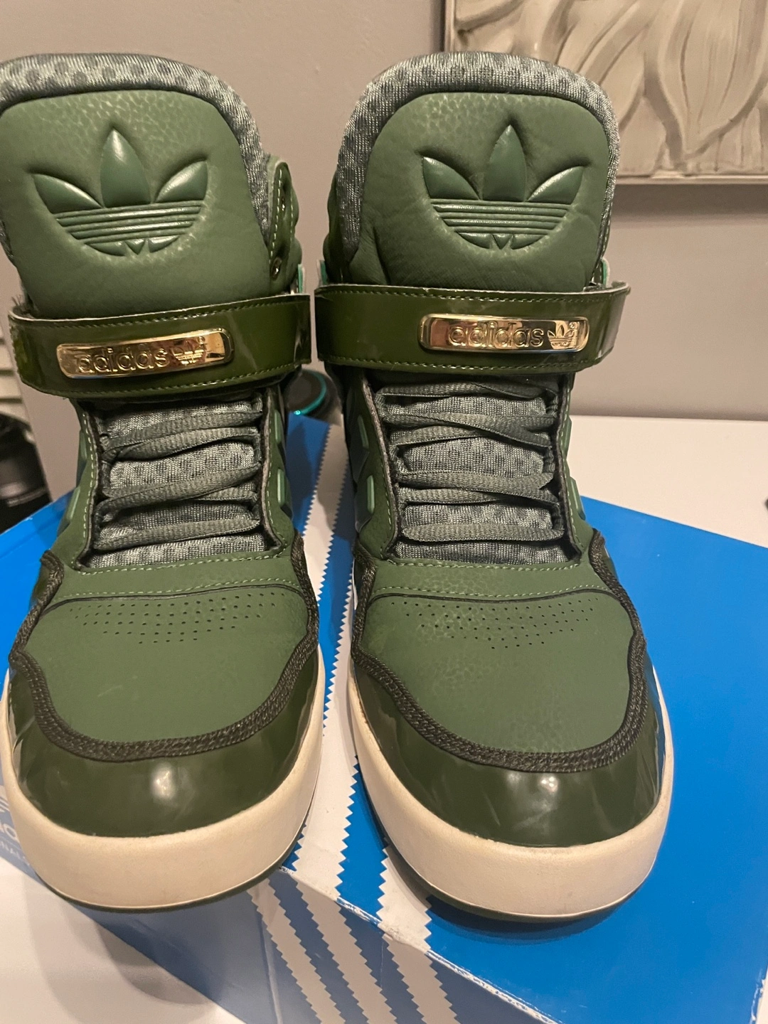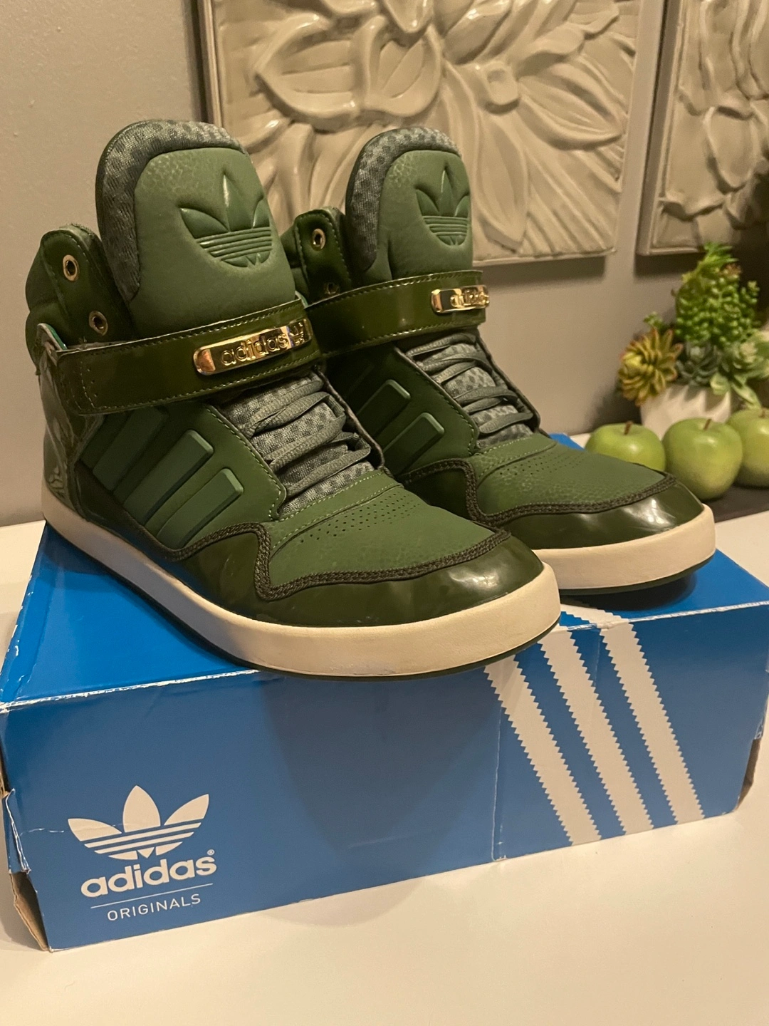 55Green Adidas high top sneakers with gold accents. Comes with box and in excellent condition size 10.