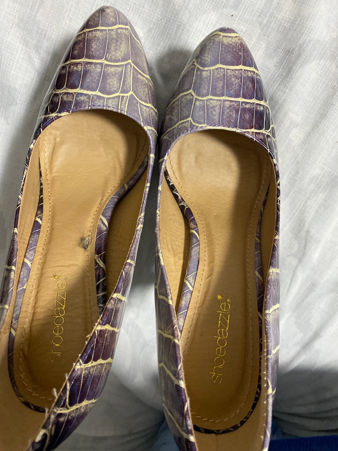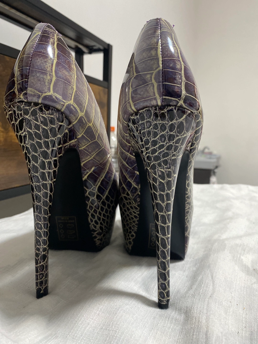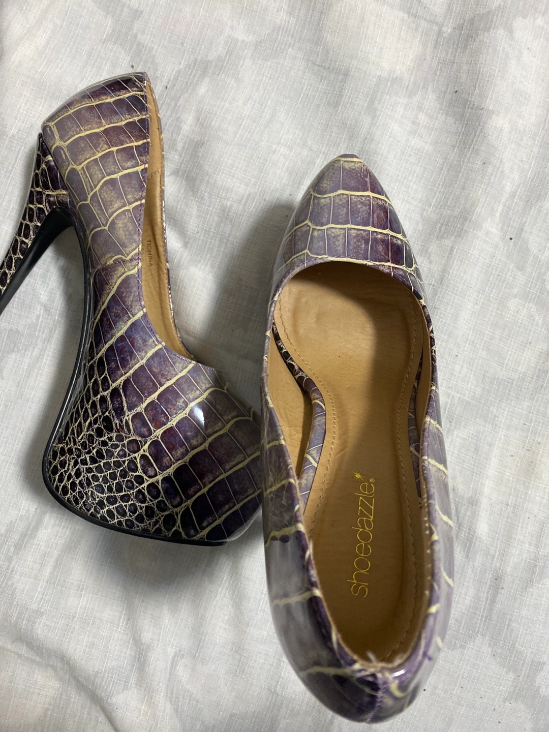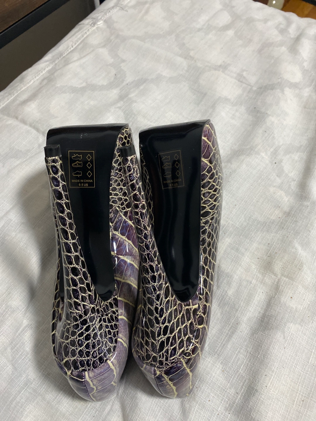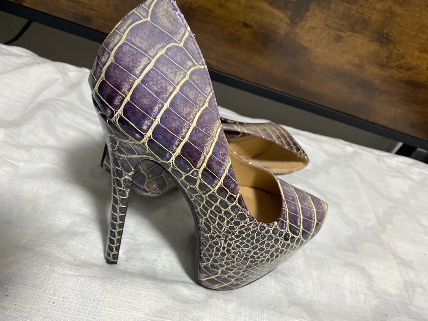 59Purple high heel shoes with a croc pattern. The shoes are size 9.