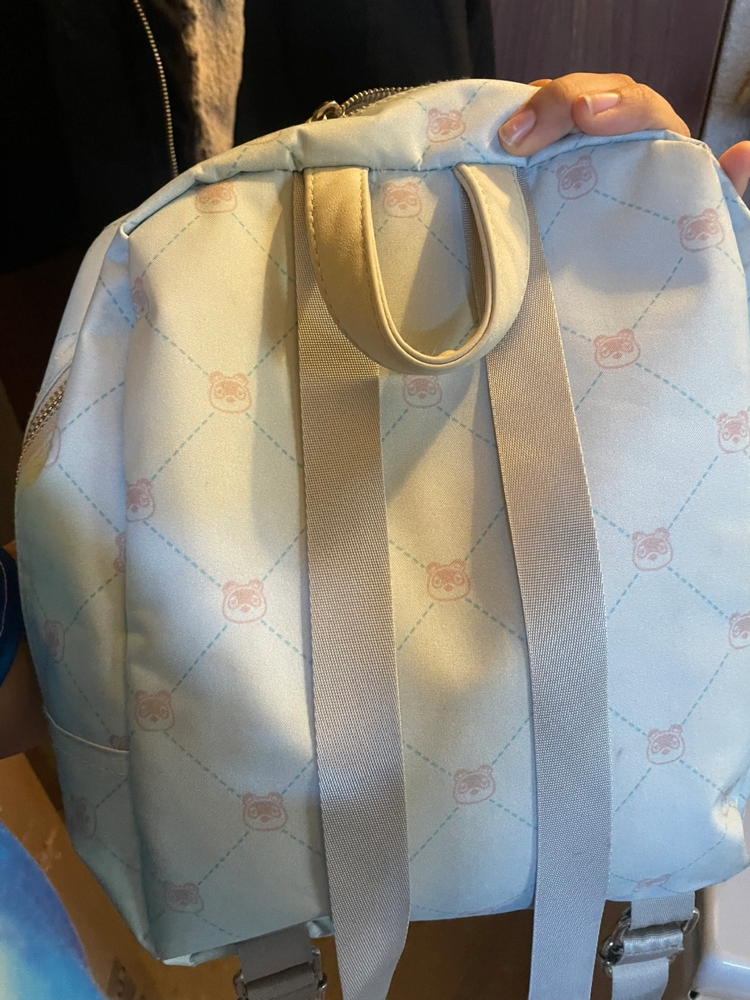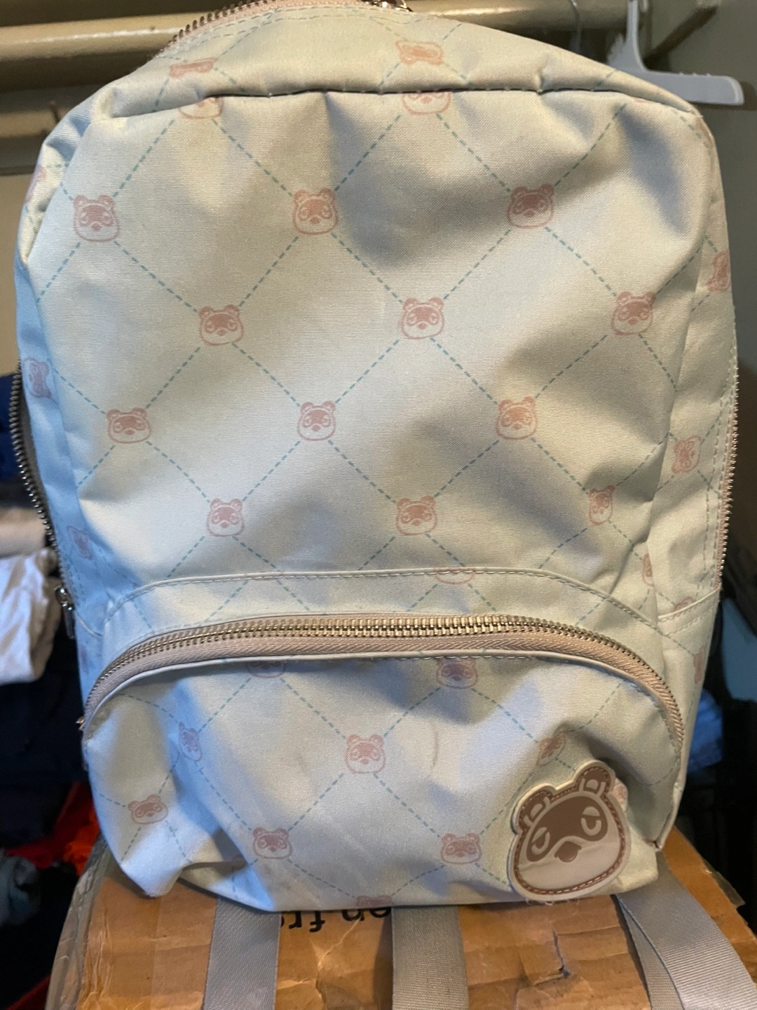 75Cute Animal Crossing backpack. Features a light blue and white design with a tan zipper and straps. Has a large zippered pocket on the front. Slight stain marks on that zippered pocket, otherwise, in great condition.