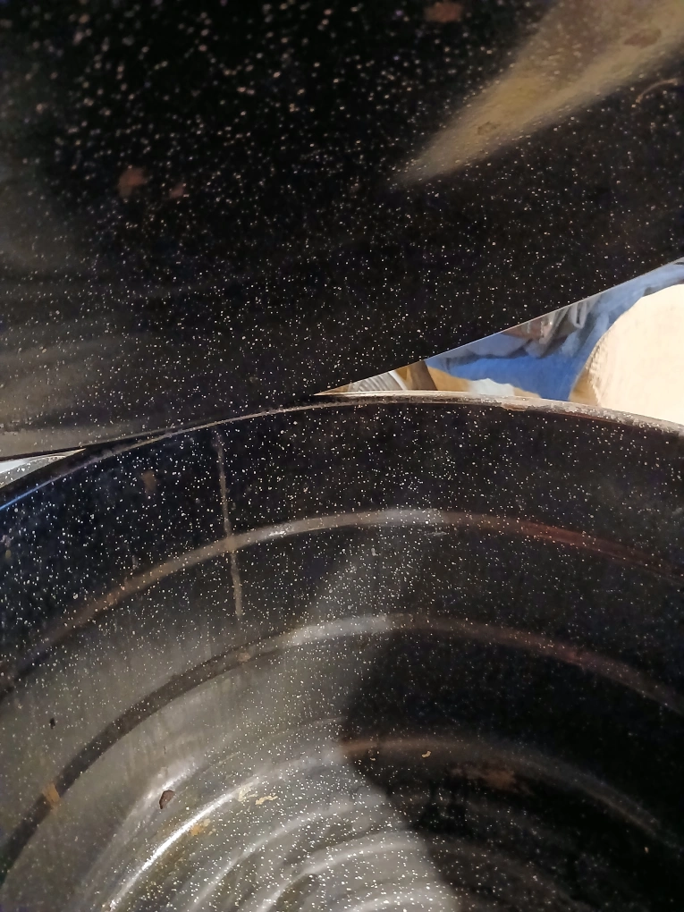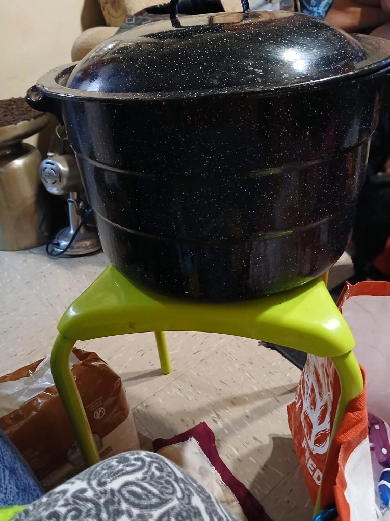 Large enamel stock pot with lid. Great for soups, stews, and canning. Has some minor wear and tear, but is in good condition.