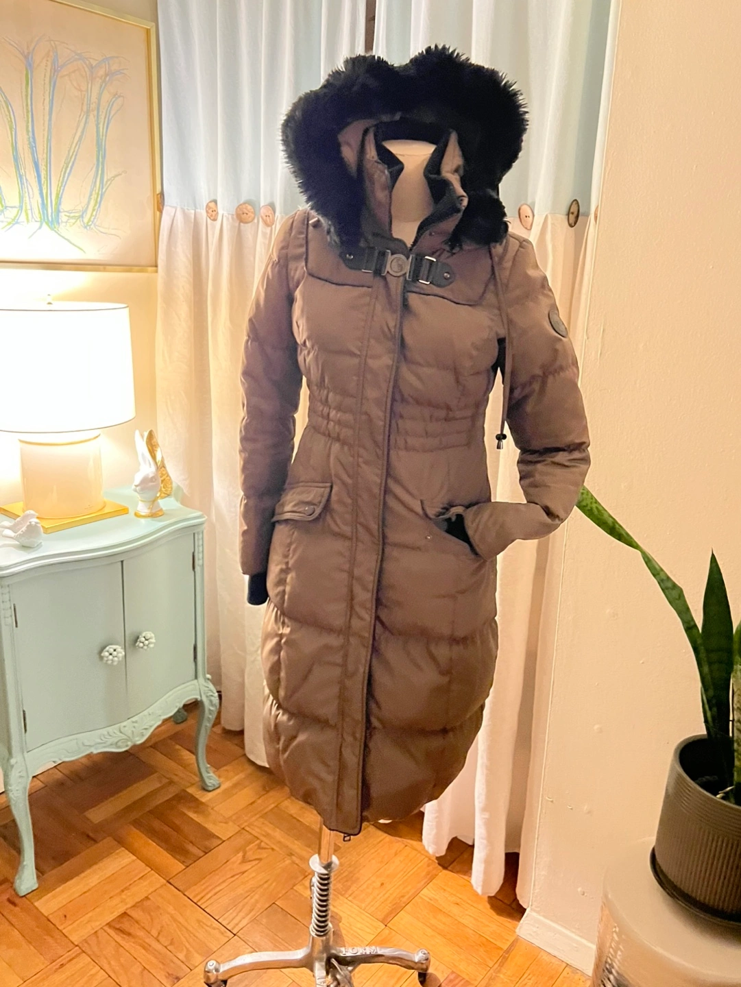 Long winter coat with a hood. The hood has a faux fur trim. coat has peeling of fabric where the snap button closure is but does not show. Otherwise excellent condition.