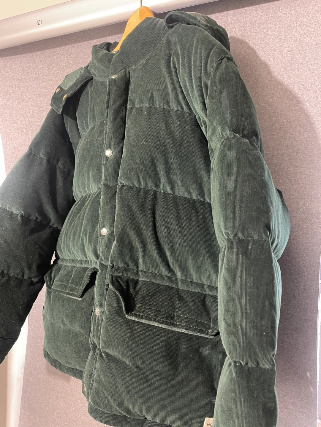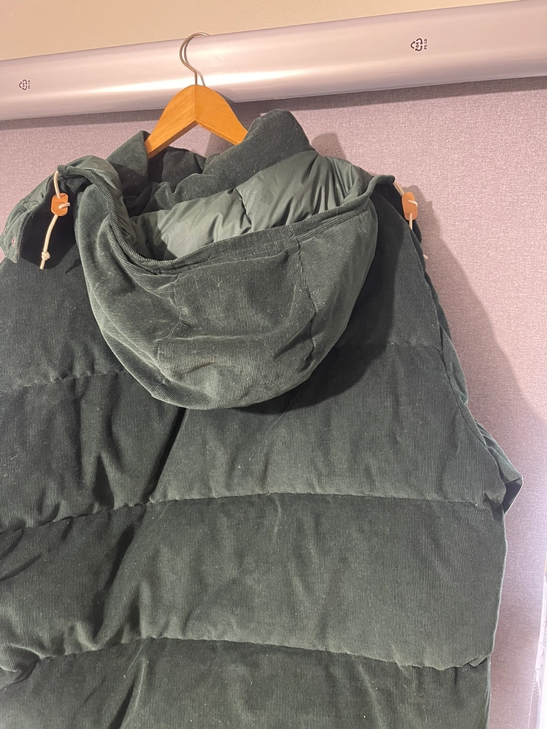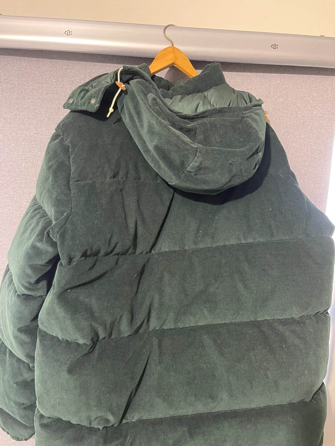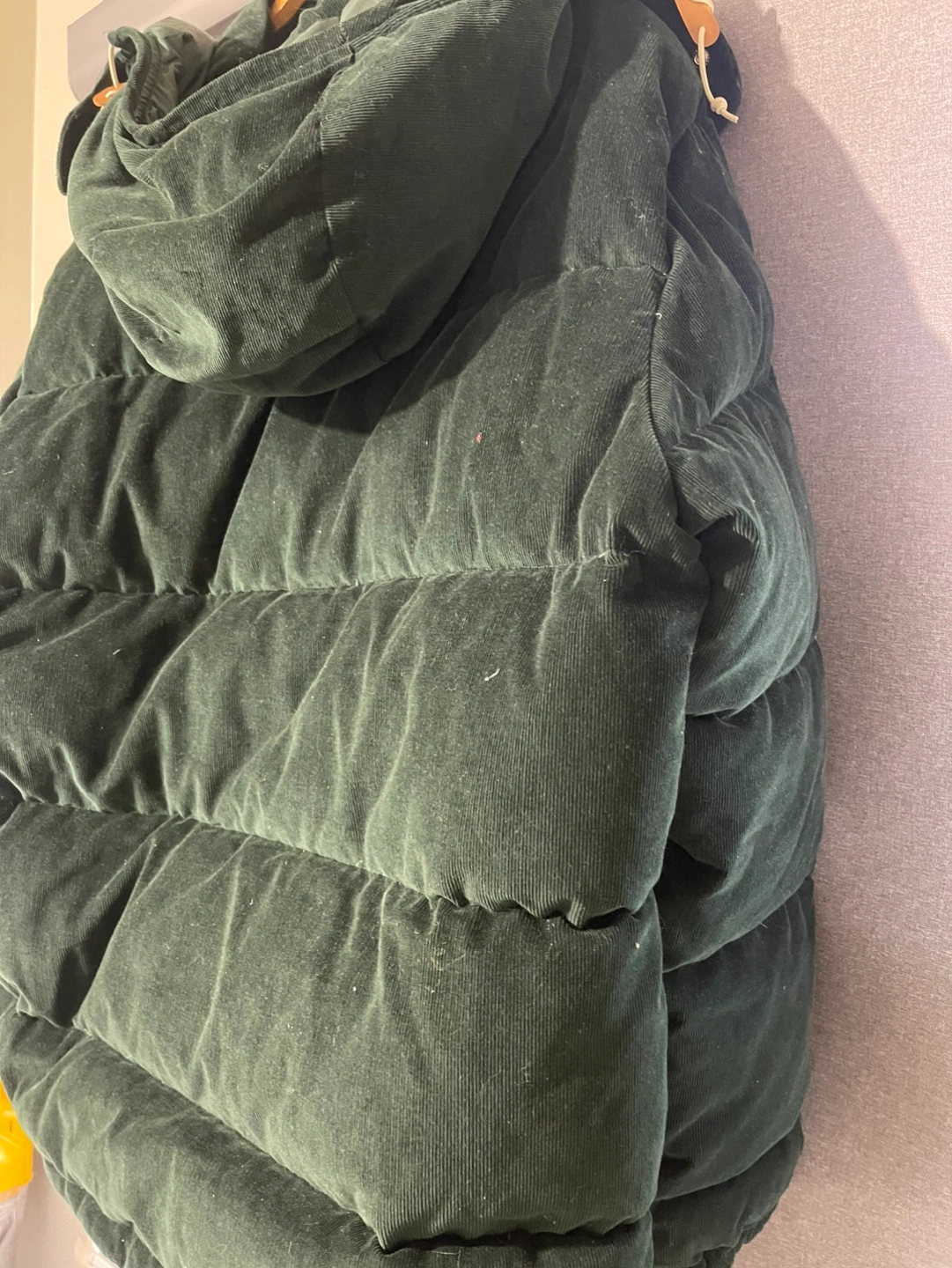 Green corduroy puffer jacket. Features a hood and snap buttons. Has a small pocket on the front. Oversized fit.