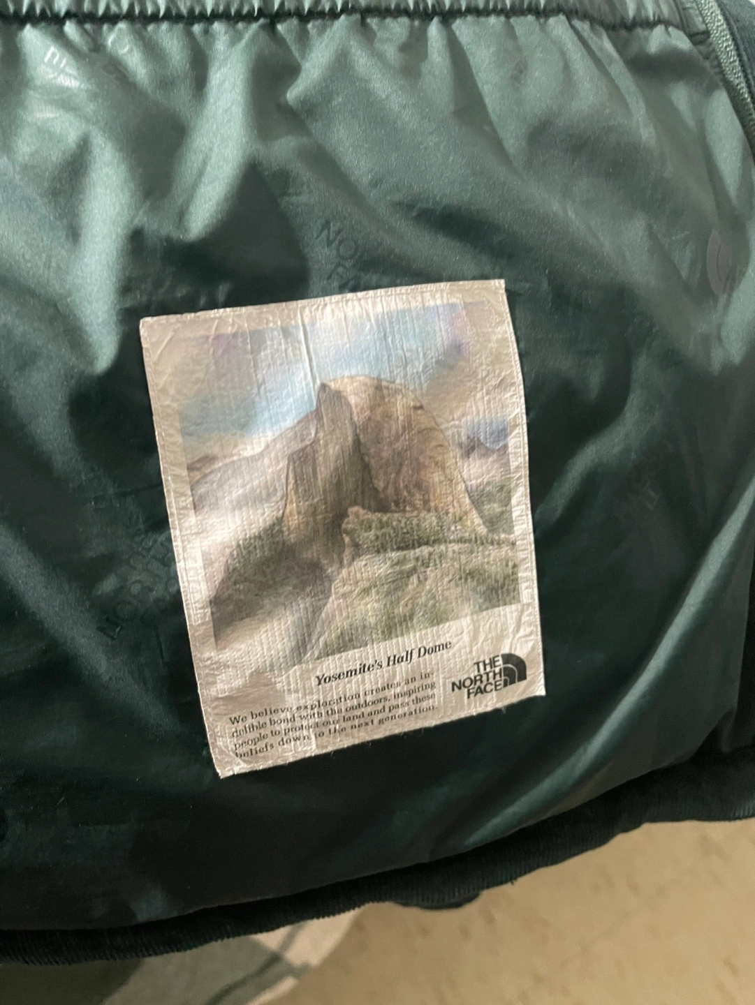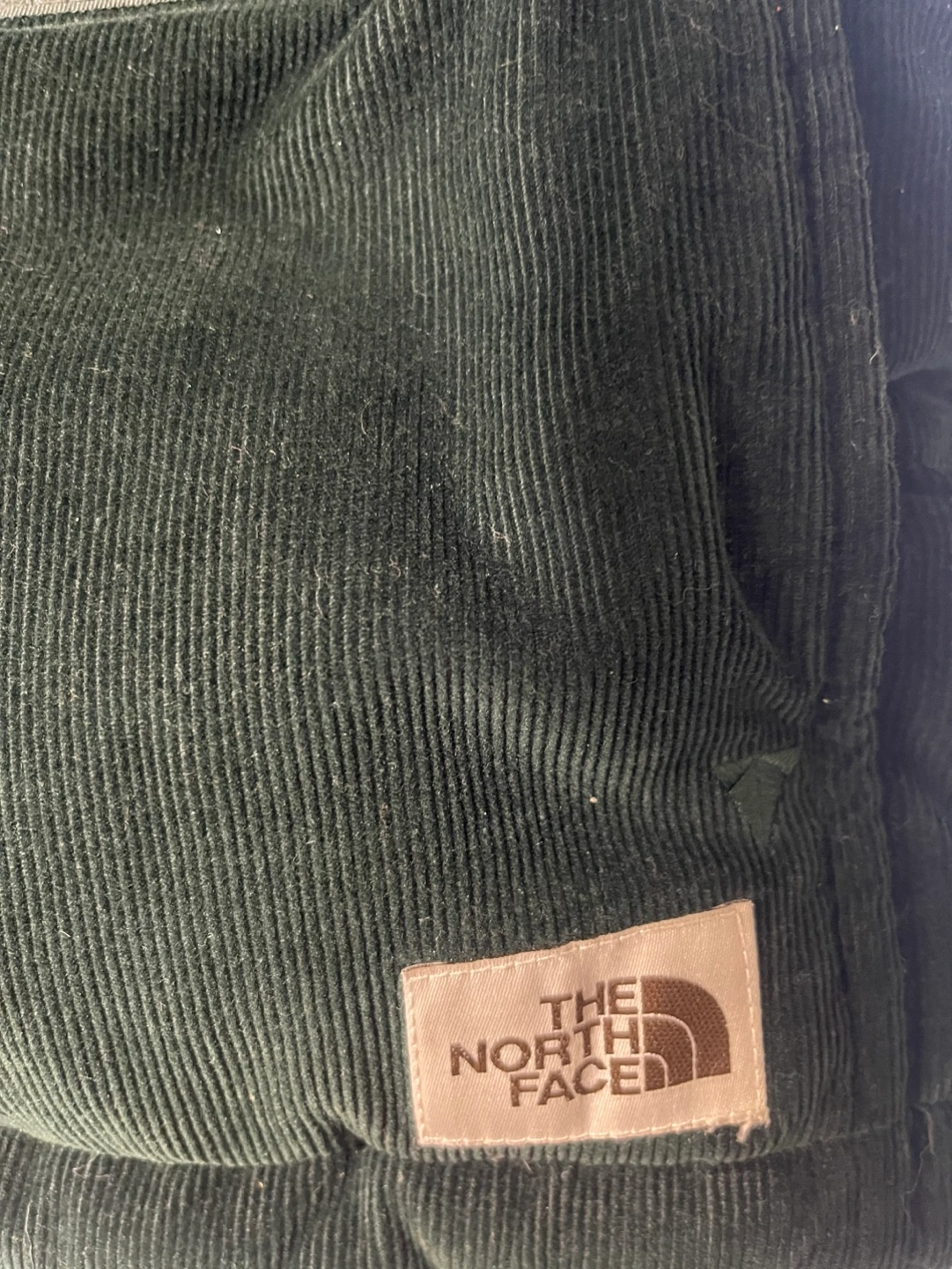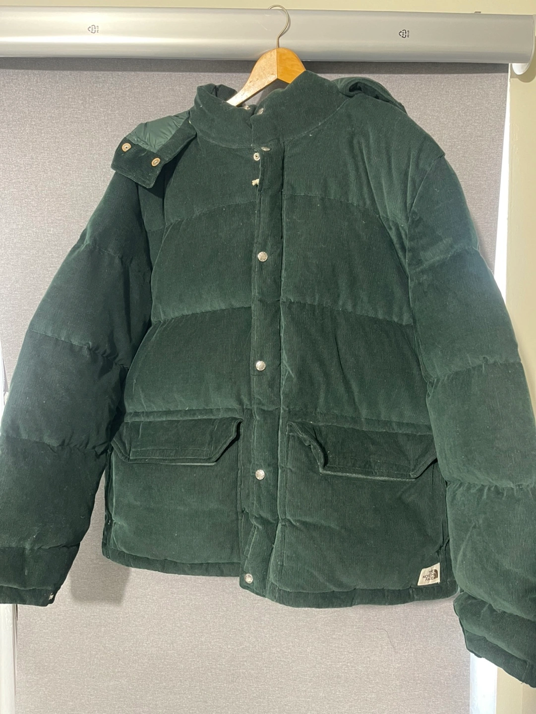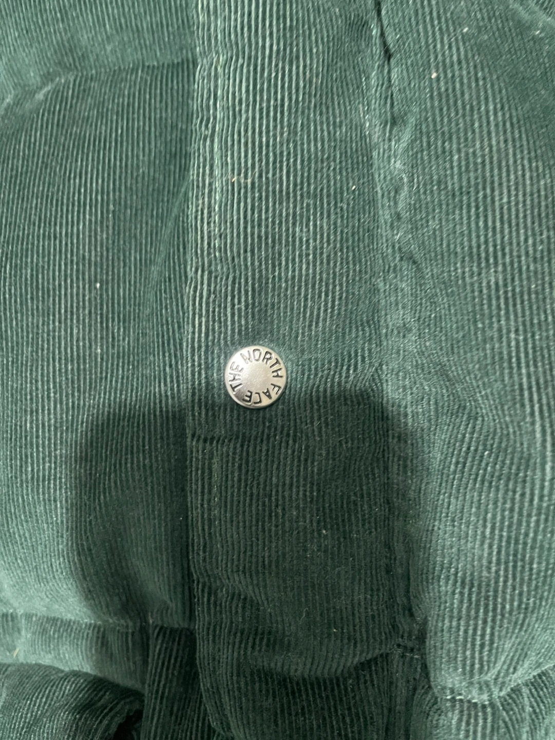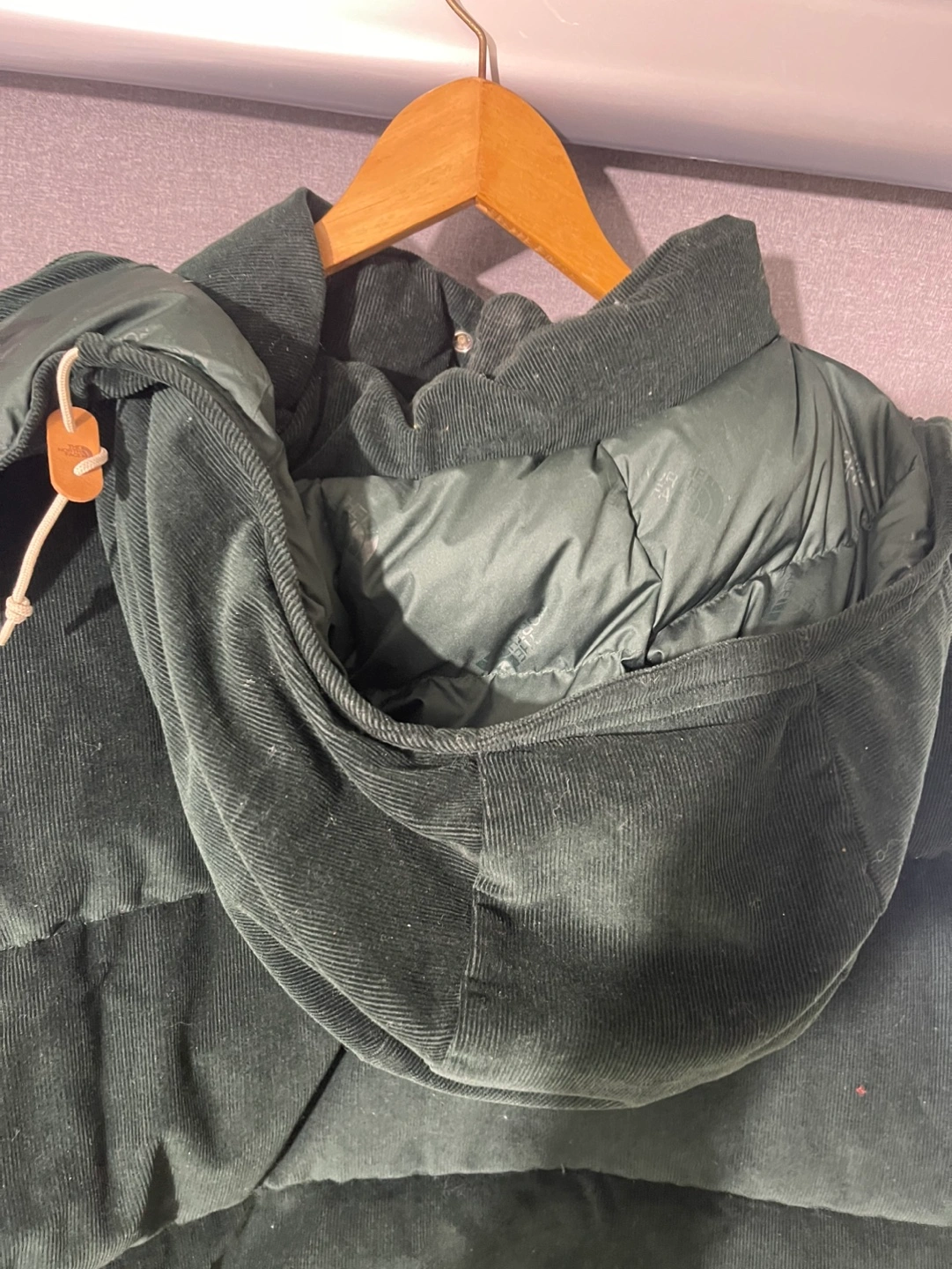 Green corduroy puffer jacket. Features a hood and snap buttons. Has a small pocket on the front. Oversized fit.