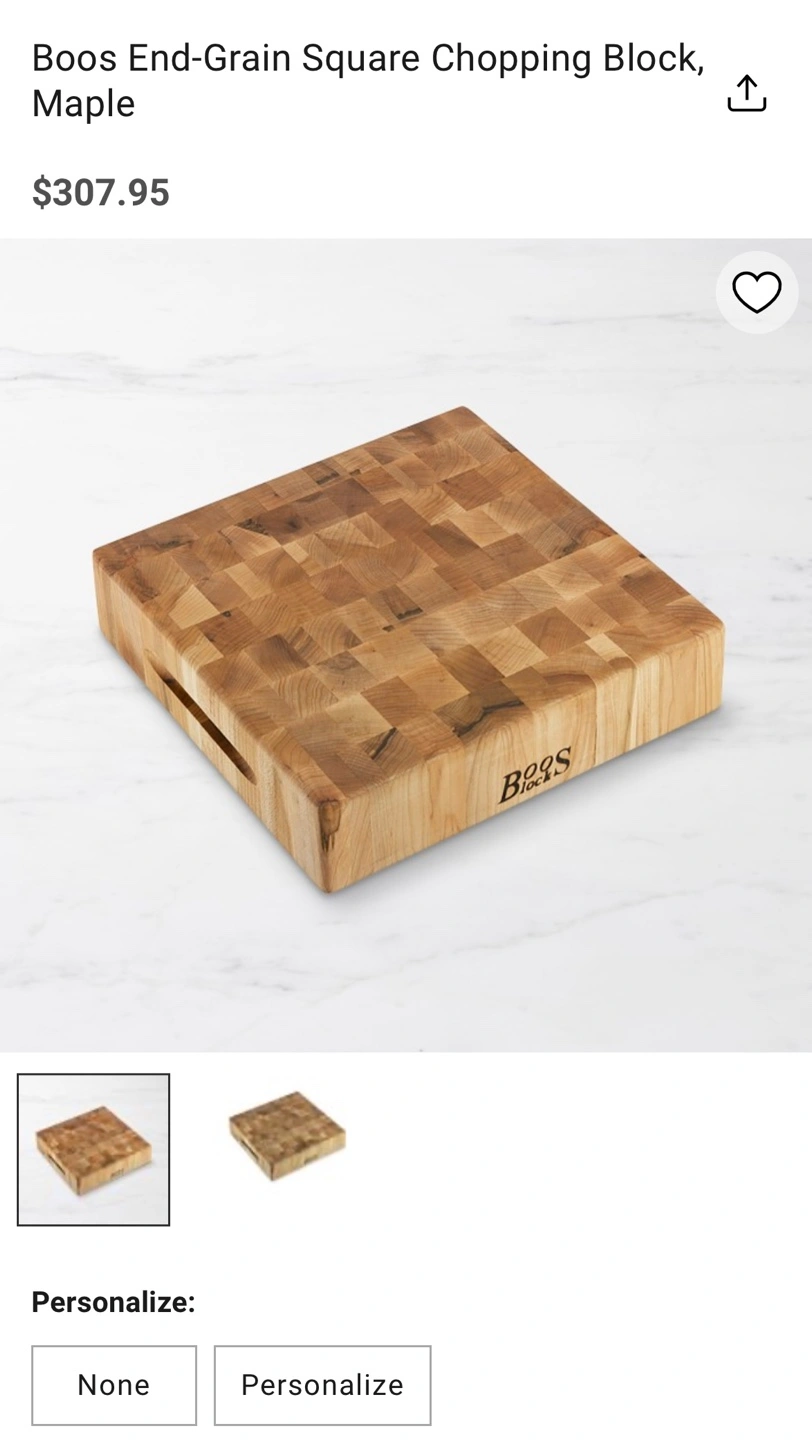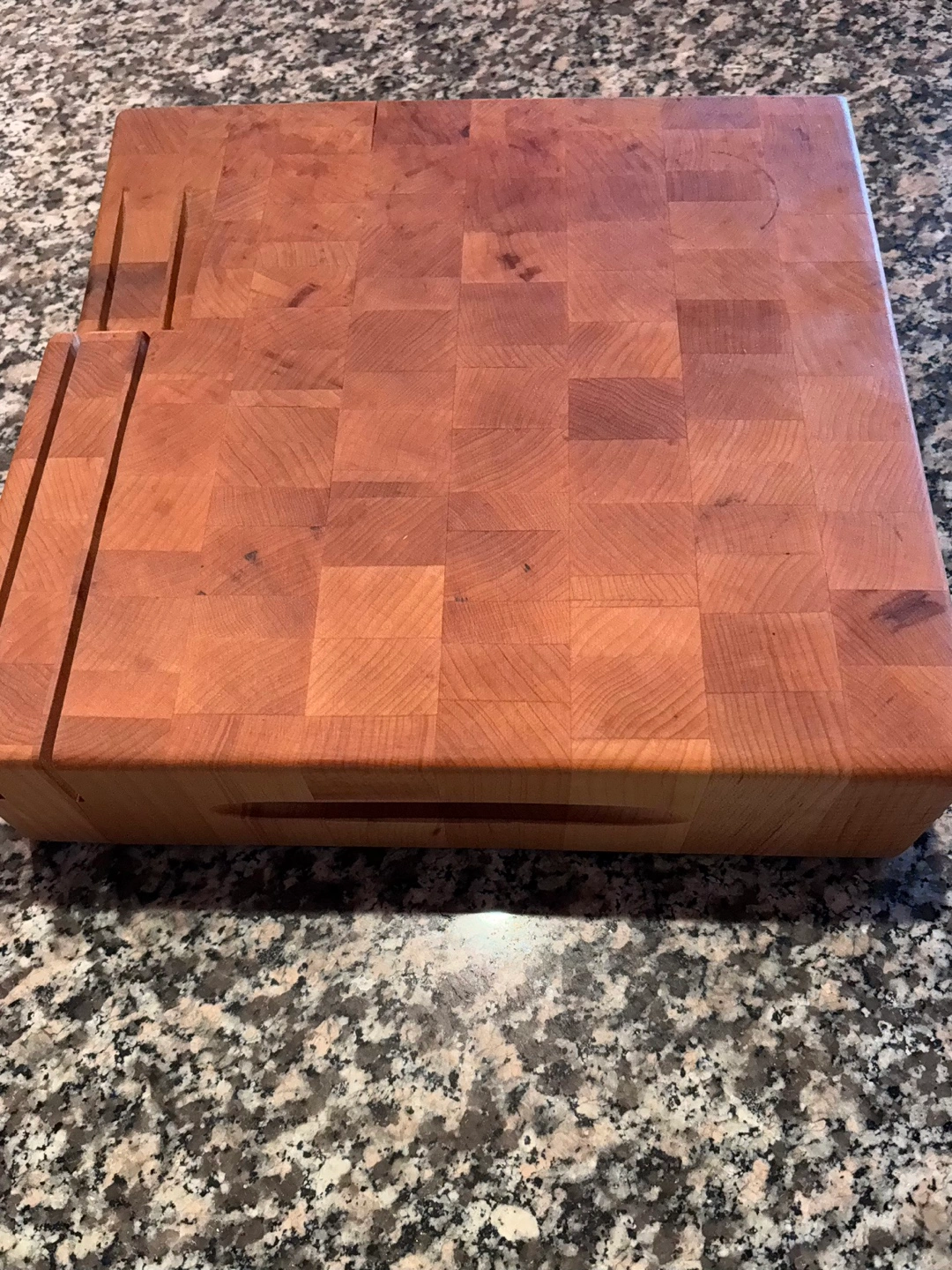 Lightly used chopping board with storage for 2 knives. 12” X 12” and 3” thick. This model is discontinued but a similar item is sold in William Sonoma (see picture 3 and description below).
