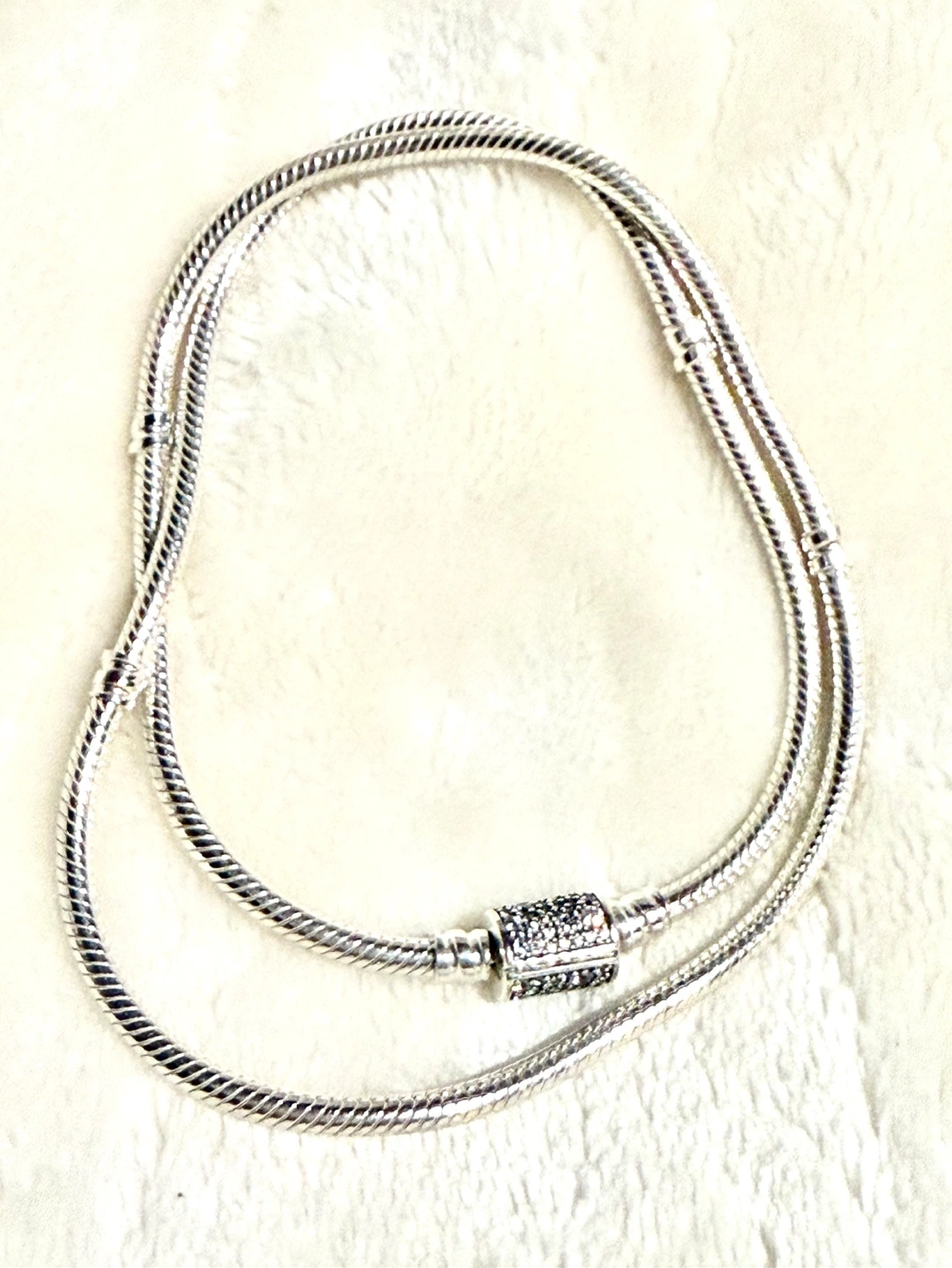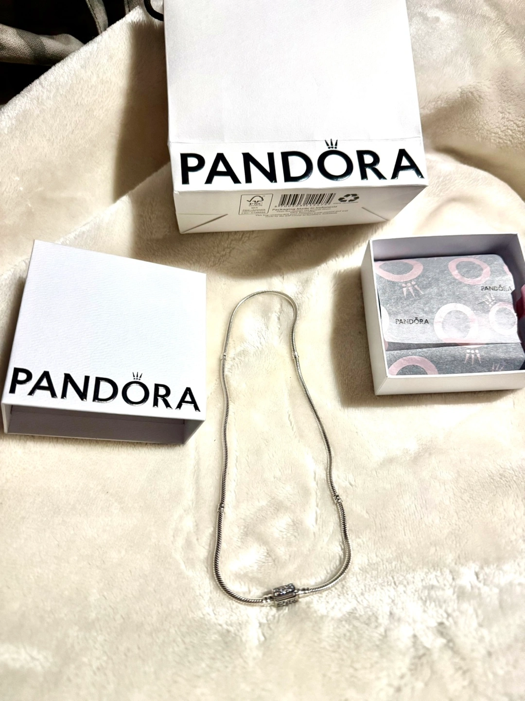 Silver snake chain necklace. Features a small clasp. Comes with original Pandora box and bag.authentic, brandnew pandora it can be necklace or bracelet available size 23 and size 21