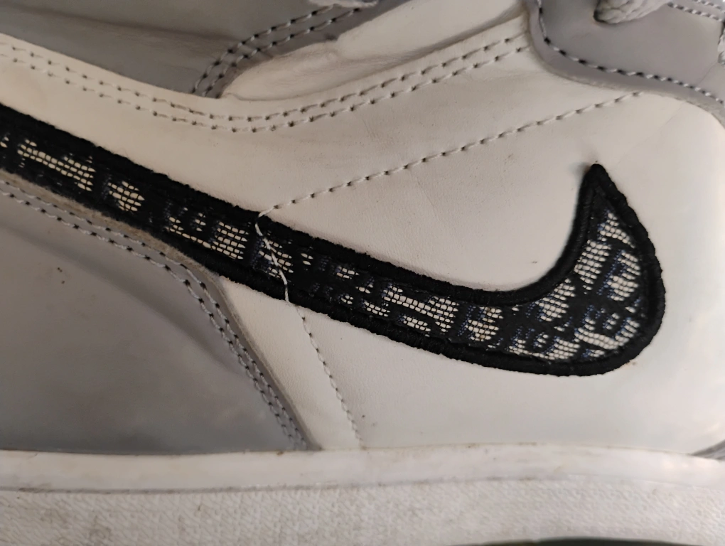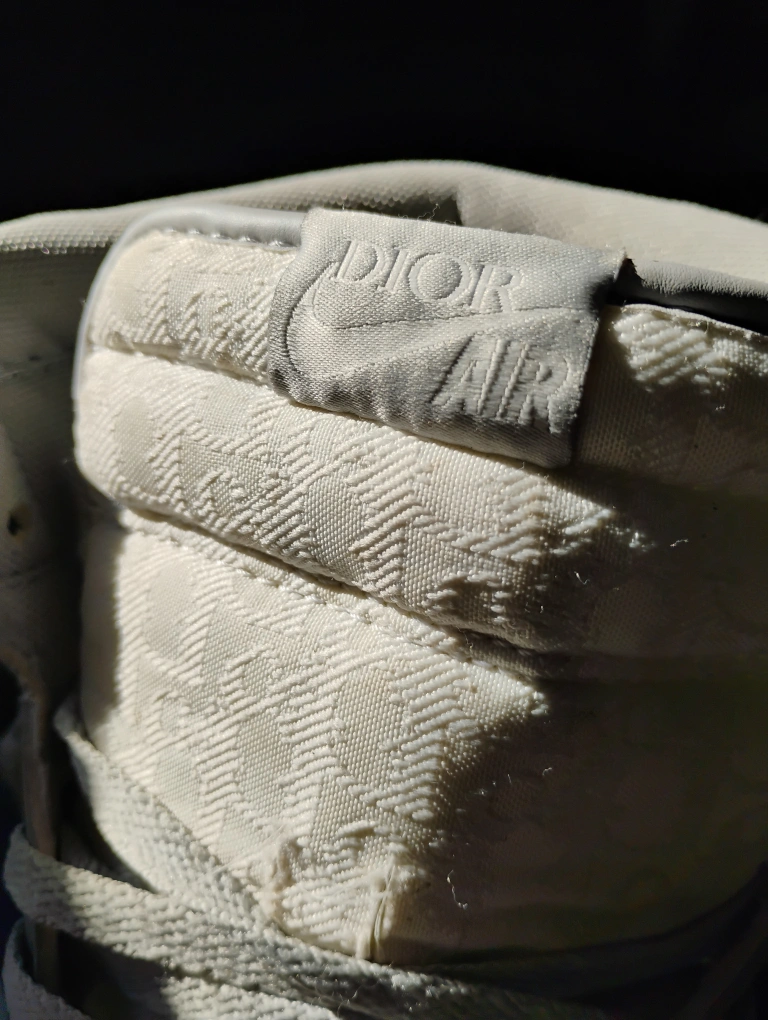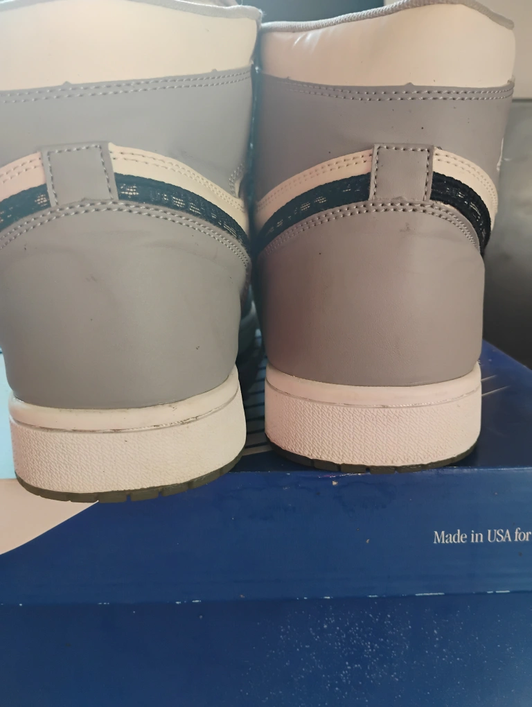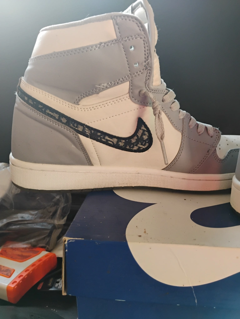 Pre-owned Air Jordan 1 High Dior sneakers. Gray and white colorway. Dior logo on the sole and side. High-top design. Minimal wear. wore 4 times