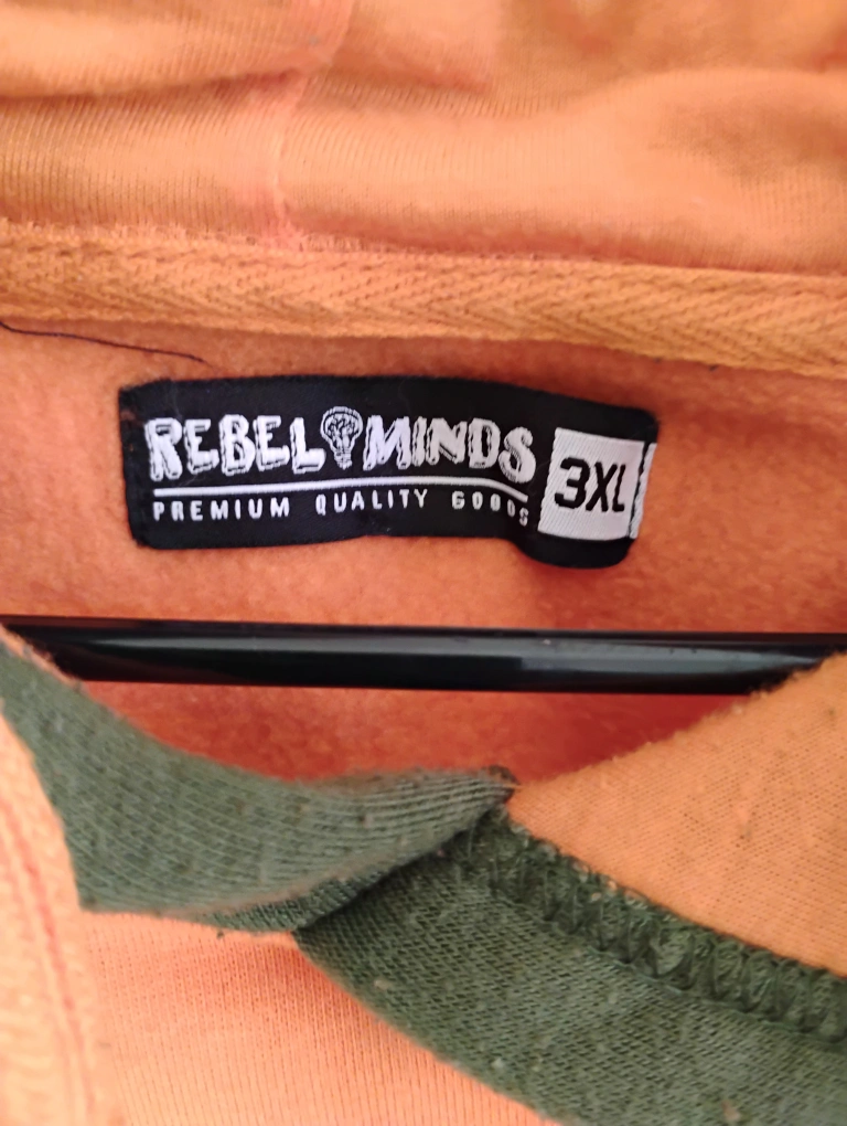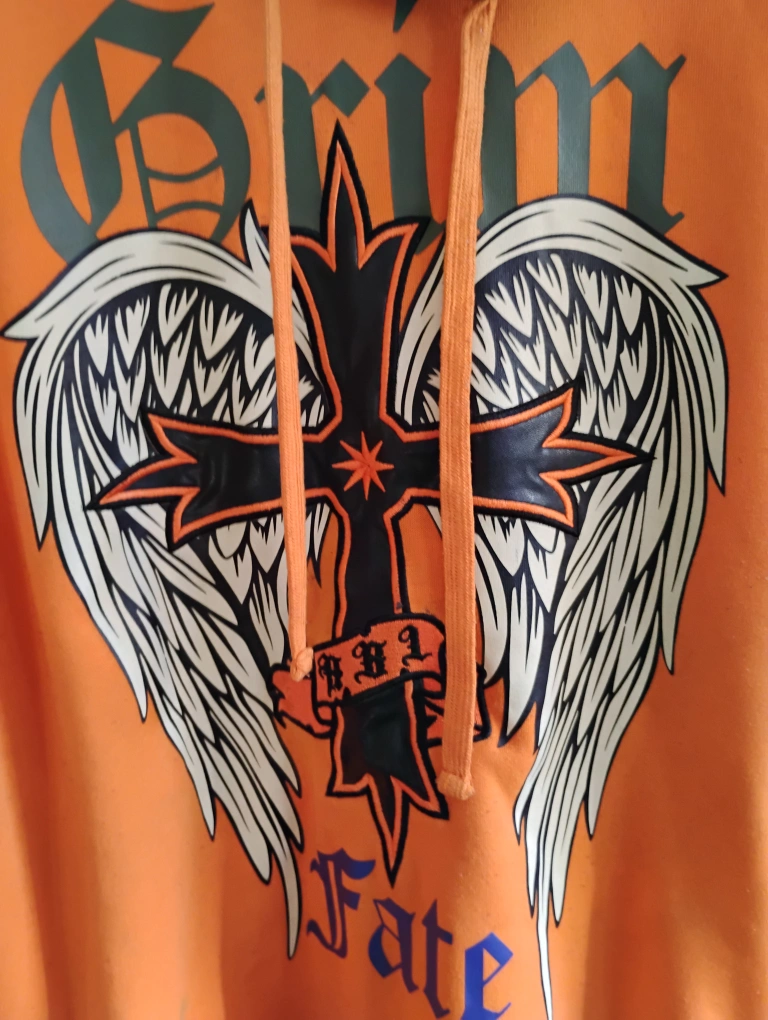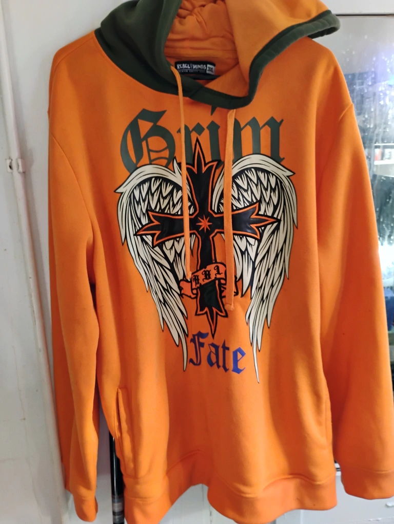 Men's orange hoodie. Features a large graphic of a cross with wings. Size 3XL. Rebel Minds brand. wore 3 times