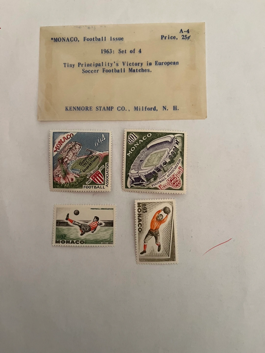 98Set of four Unused 1963 Monaco Vintage postage stamps. Commemorates soccer victory. Tiny Principality's victory in European soccer football matches. Great for Collectors and Enthusiasts.