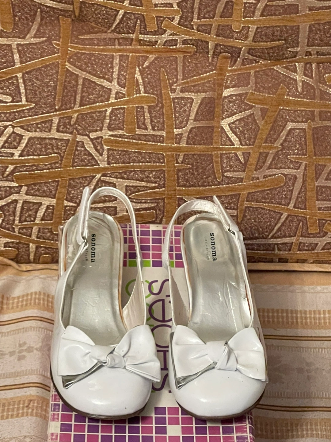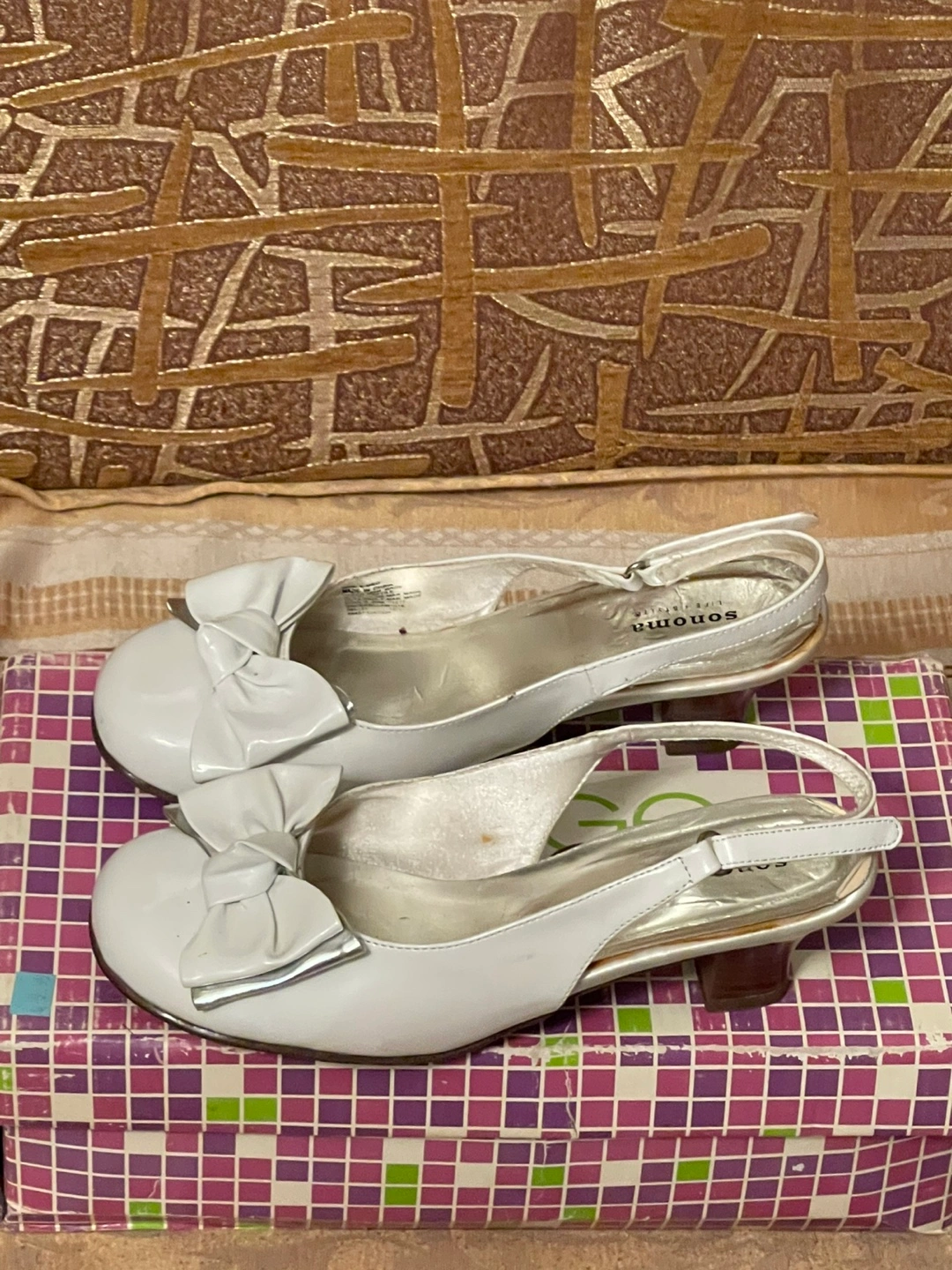 33Adorable girls' white patent leather slingback heels. Features a cute bow accent. Low heel. Perfect for special occasions. Price $16 negotiable