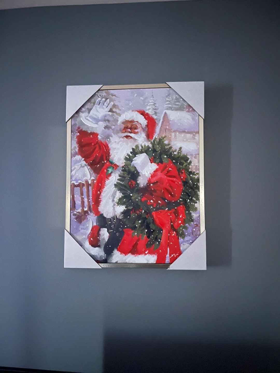 15Framed Santa Claus artwork. Depicts Santa with a large Christmas wreath. Snow scene. Ready to hang.