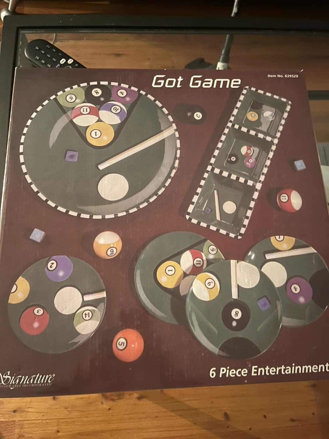 15Six-piece billiard-themed entertainment set. Includes plates and serving tray. Great for game night.