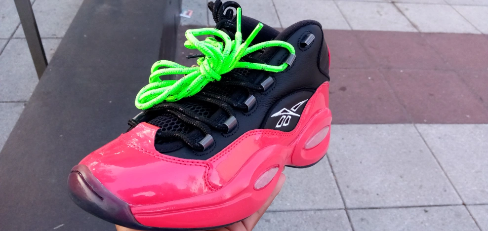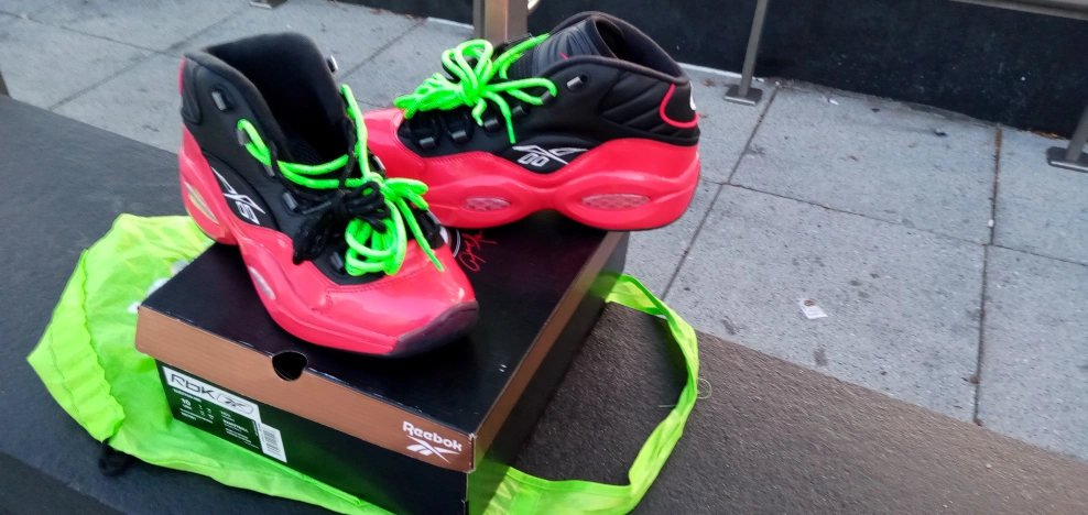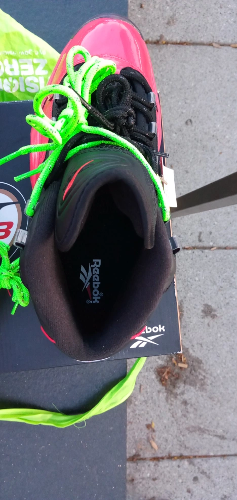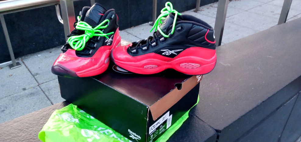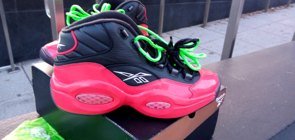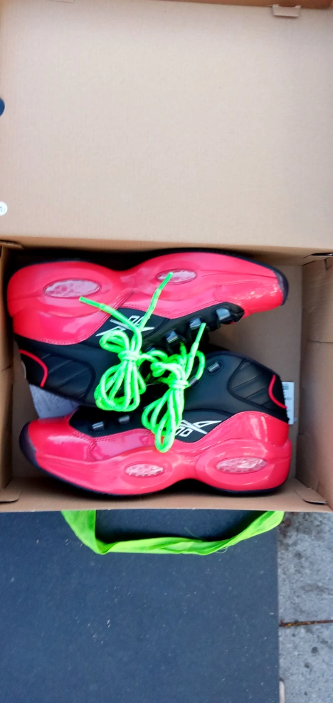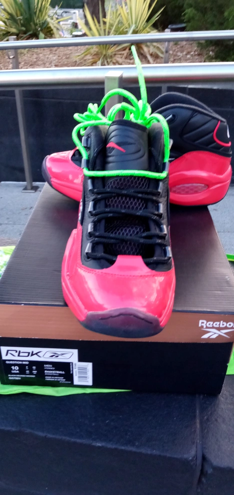Brand New In Box Reebok Men's Iverson Question Mids Black, Vector Red Patten Leather Comes with Neon Green alternate laces Sz. 9.5