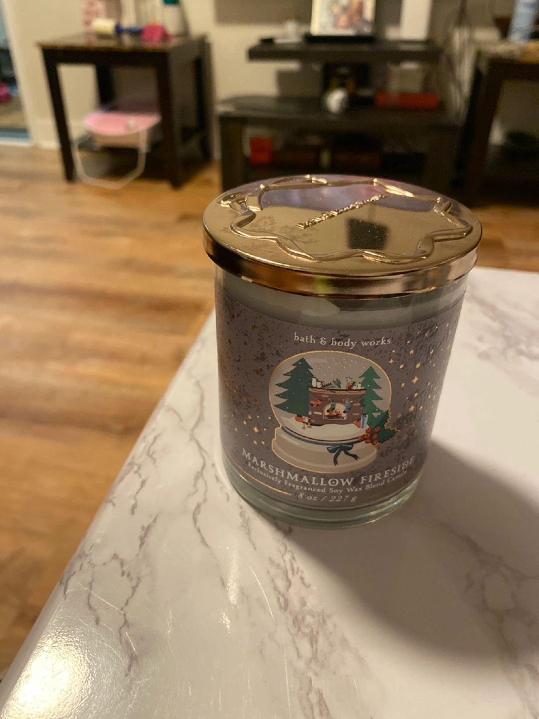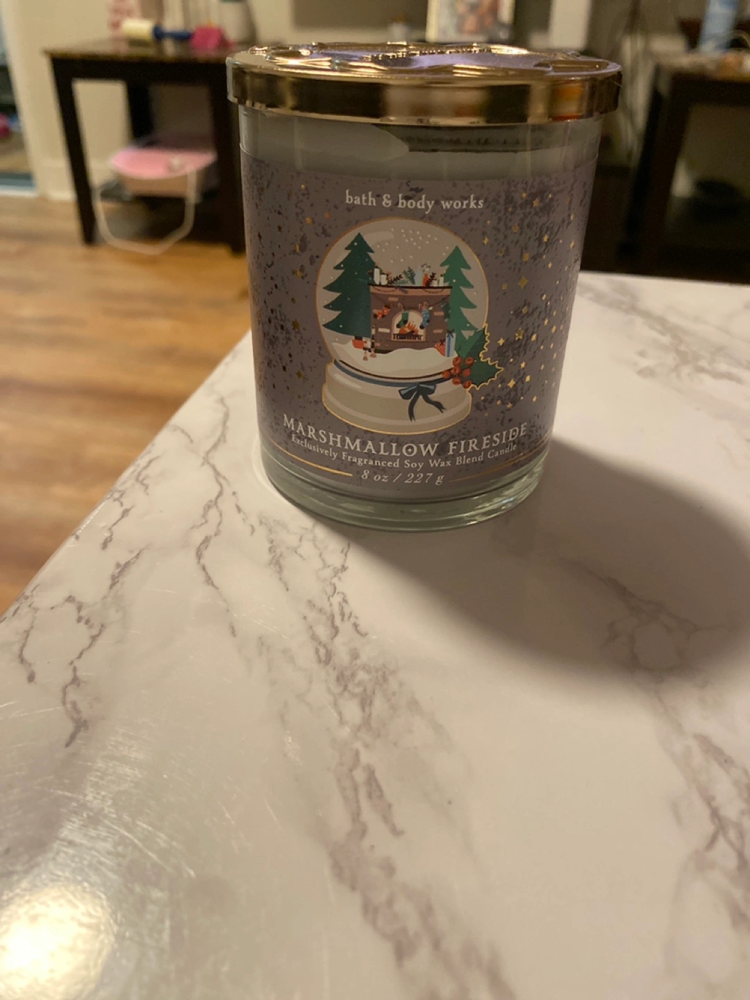 8 oz candle. Scented soy wax blend. Gold lid. Winter-themed design.