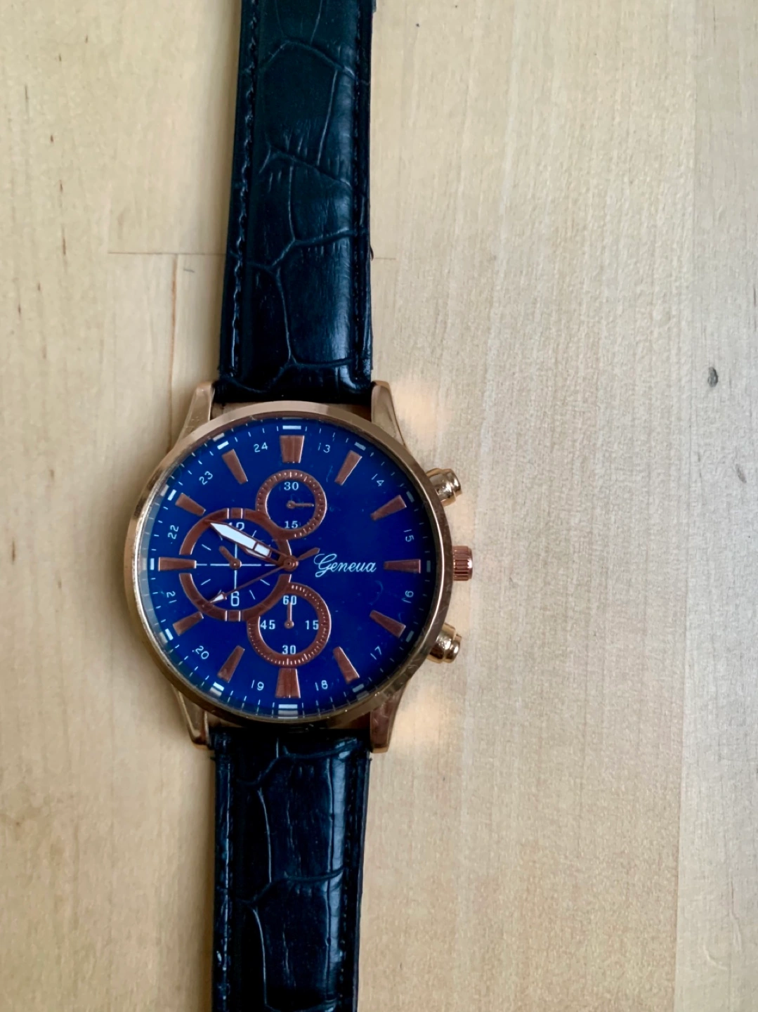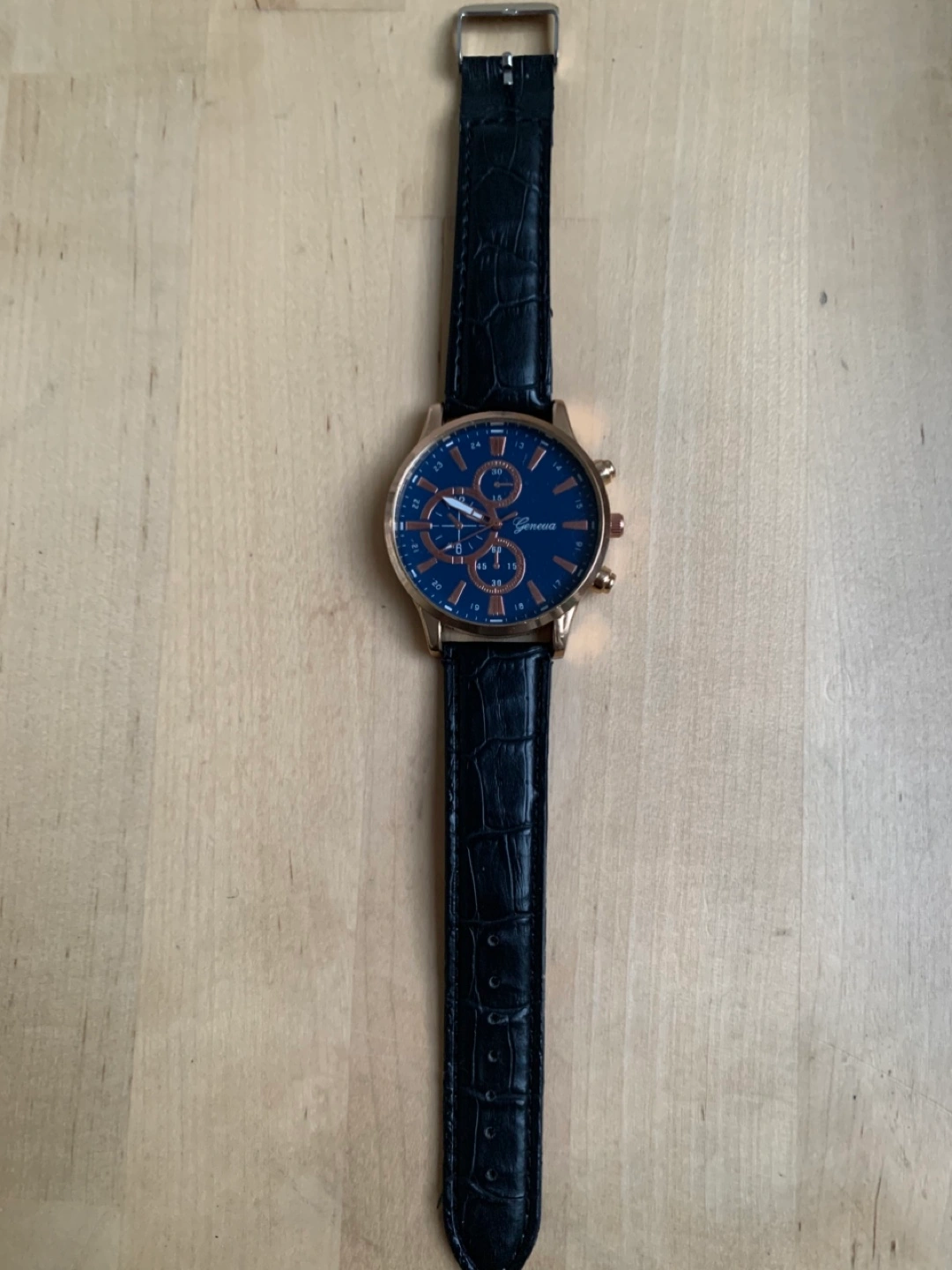 Stylish men's watch. Blue face, rose gold accents. Black leather band. Chronograph functions. Great everyday timepiece.