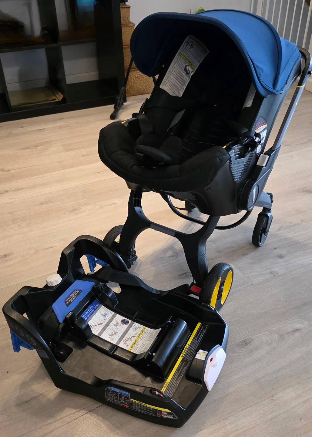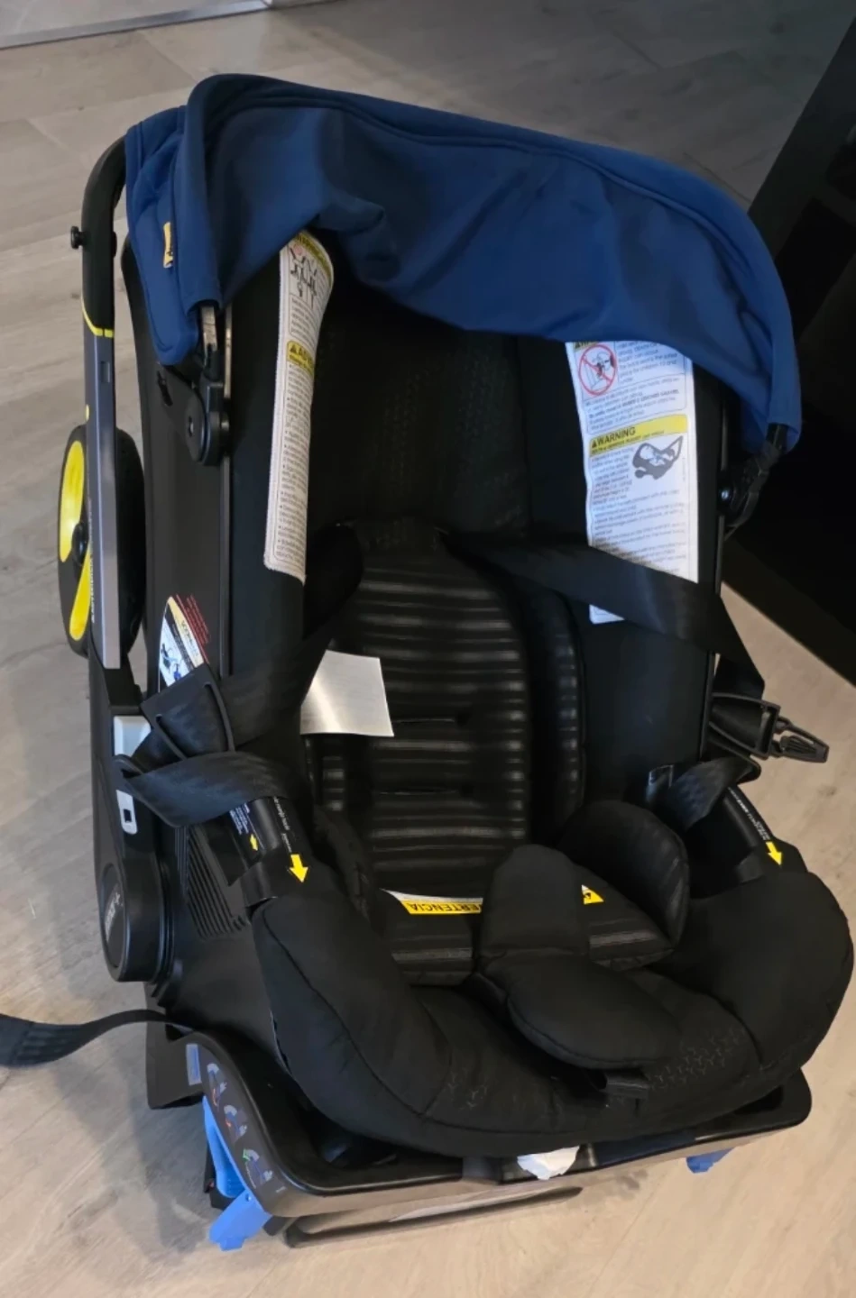 Selling a Doona infant car seat and stroller combo in black and Blue. This is a convenient travel system that easily converts from a car seat to a stroller. It's in great condition and ready for its next little one!