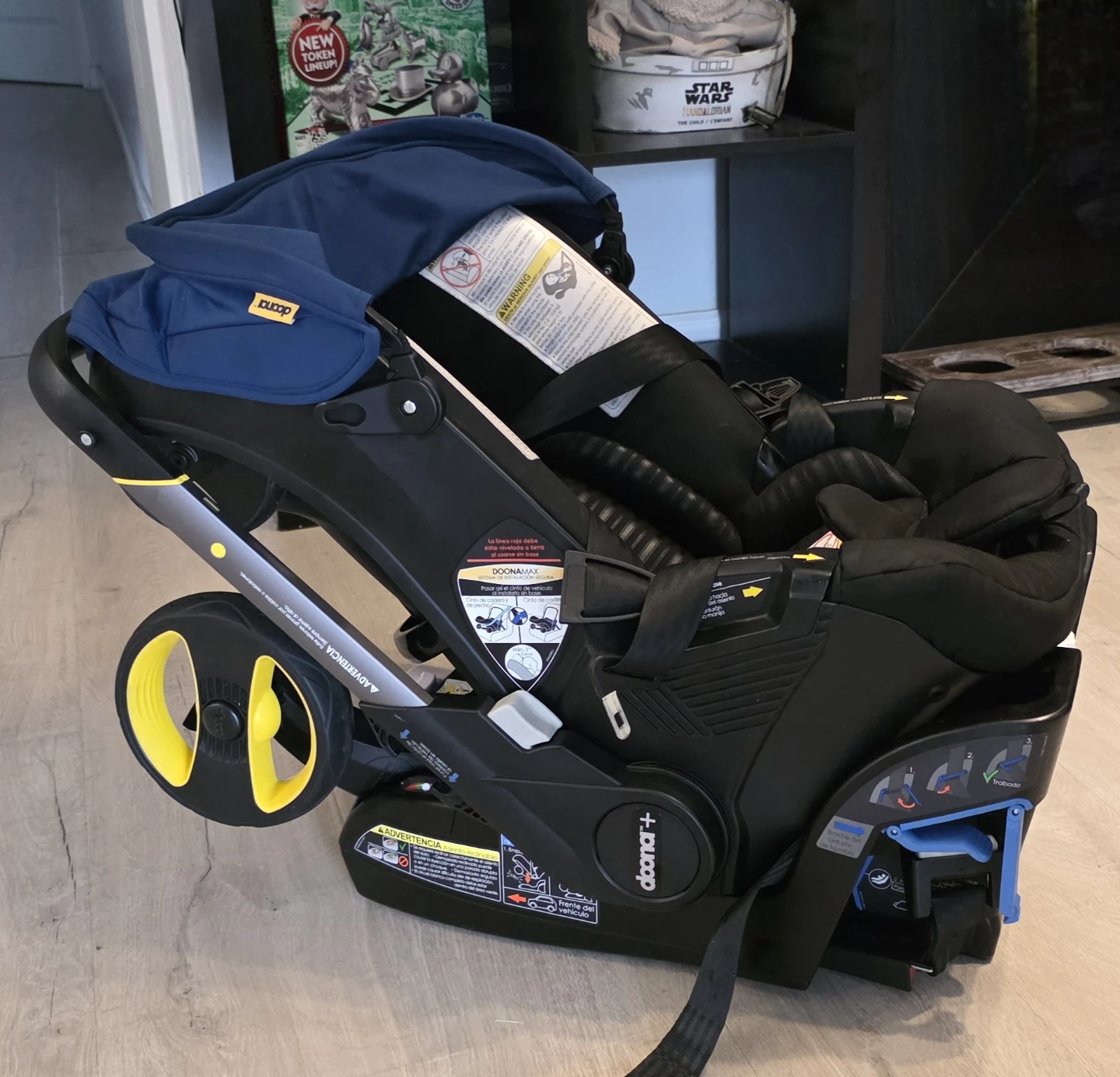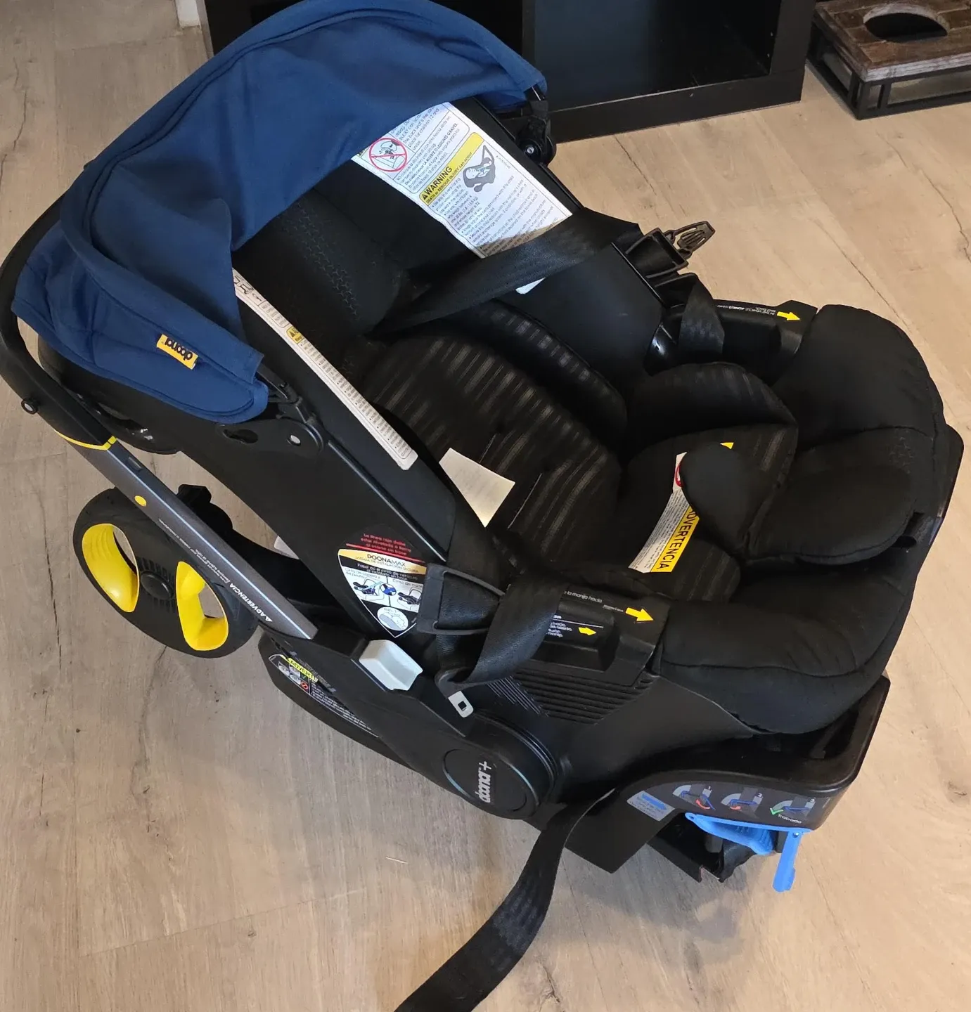Selling a Doona infant car seat and stroller combo in black and Blue. This is a convenient travel system that easily converts from a car seat to a stroller. It's in great condition and ready for its next little one!