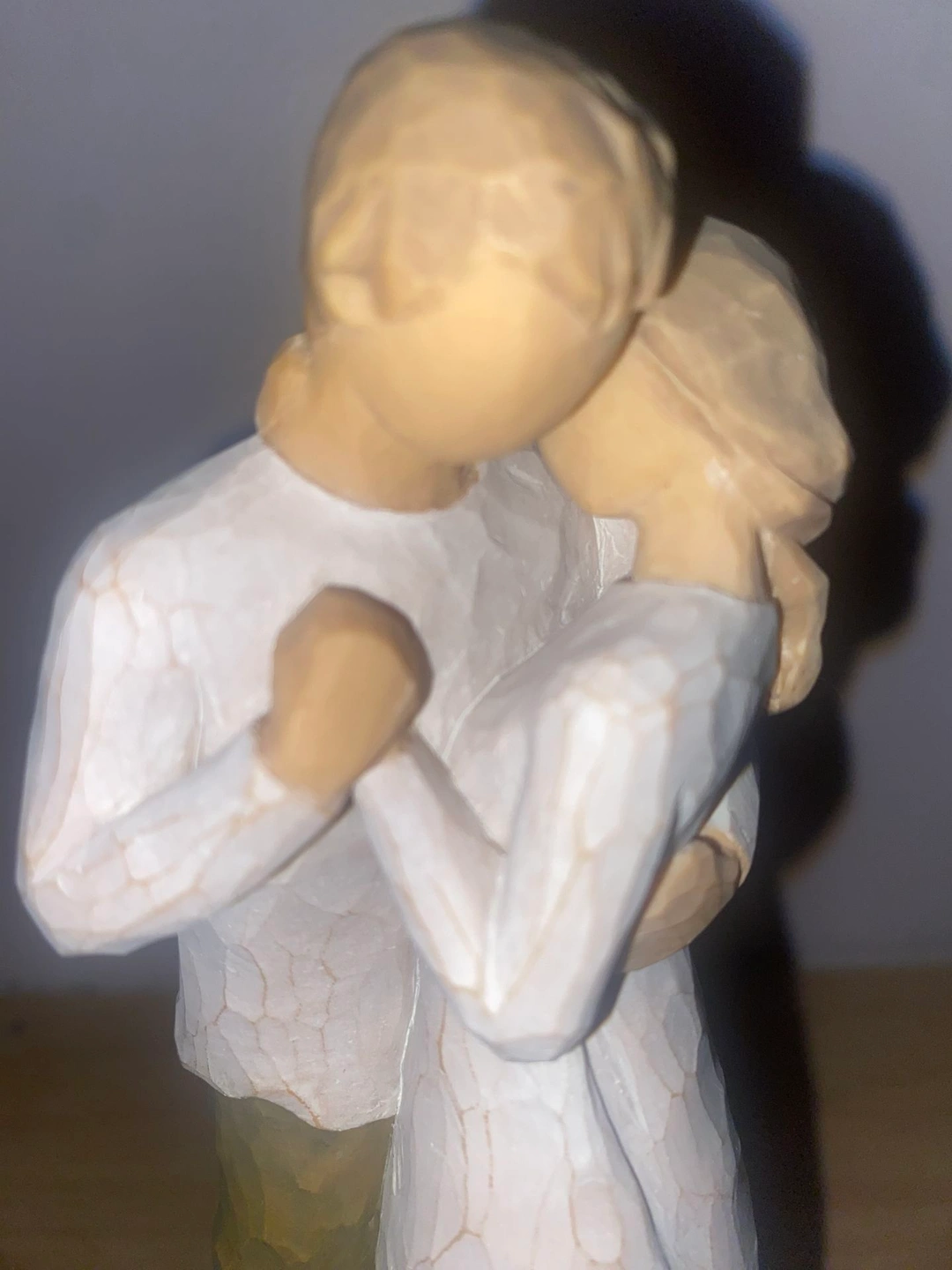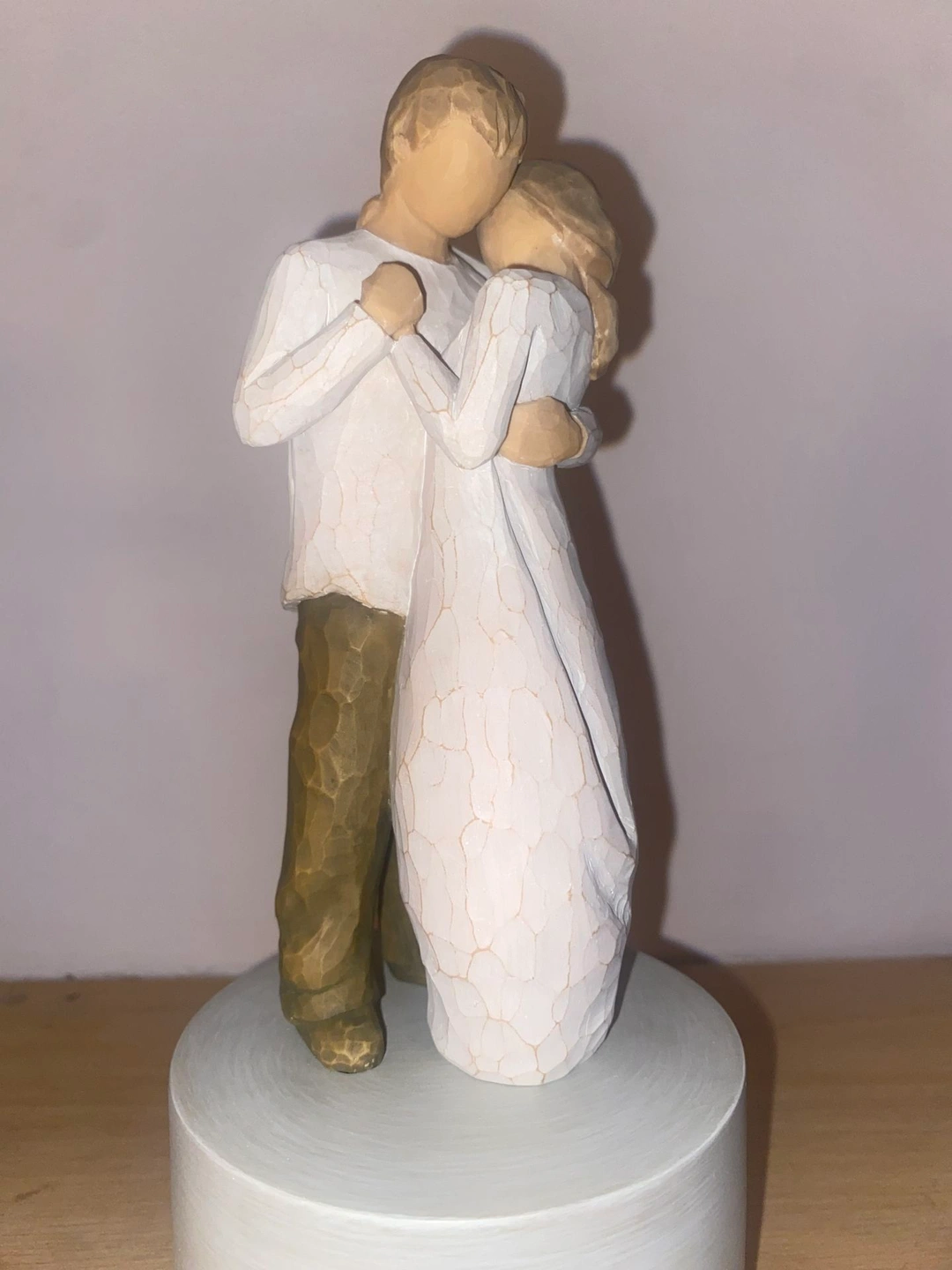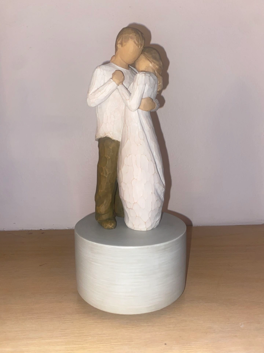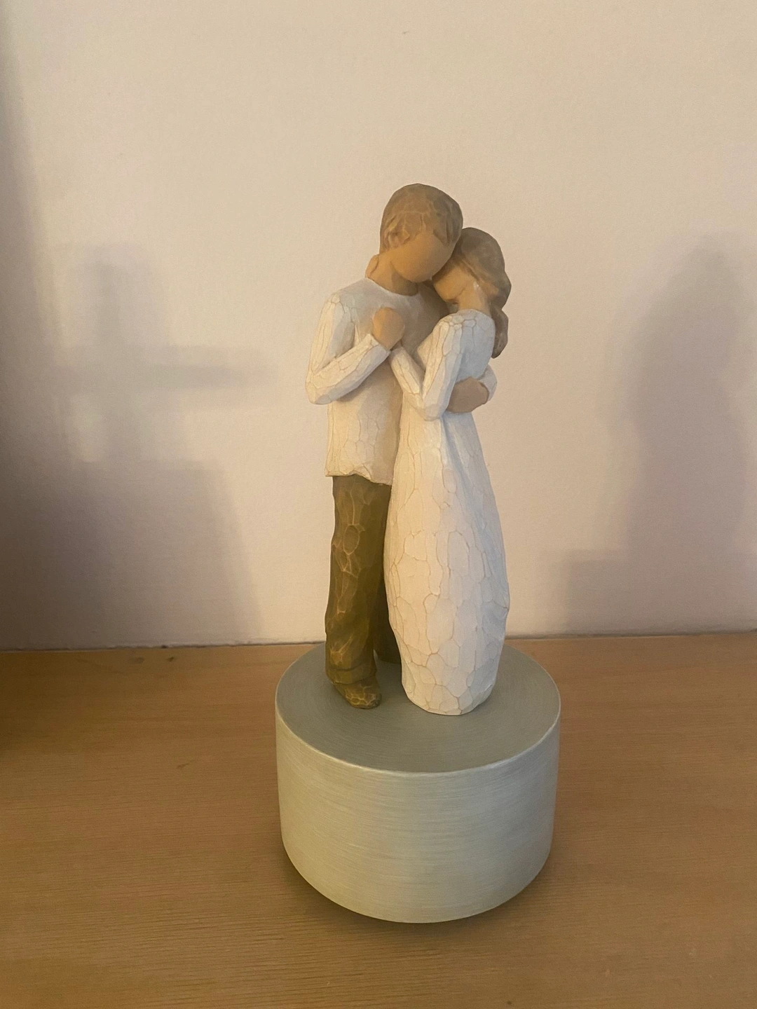 Willow Tree Promise Musical figurine featuring a couple dancing on a rotating base. Designer: Susan Lordi. Plays Pachelbel's "Canon in D Major" and rotates. Hand-painted resin. Approximately 8 inches high. Pickup in Orland Park or Countryside.