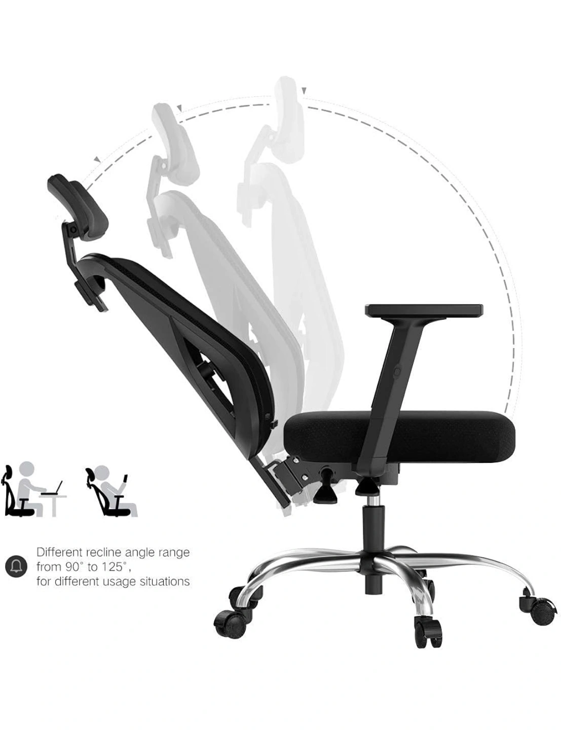 Comfortable mesh back. Adjustable height armrests. Reclines 90-125 degrees. Headrest included. Silver base with caster wheels.